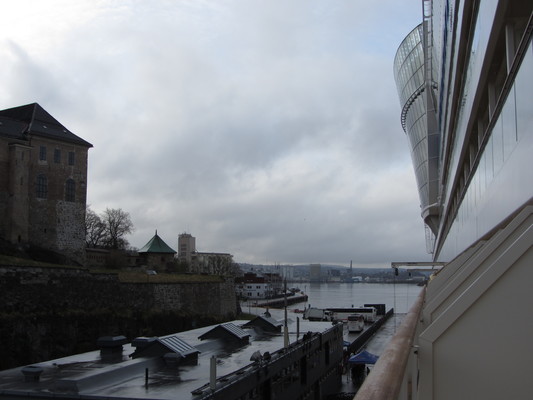 Vom Balkon aus haben wir eine gute Sicht auf Fjordlandschaft und freuen uns schon auf die Stadt und den Ausflug nachher.