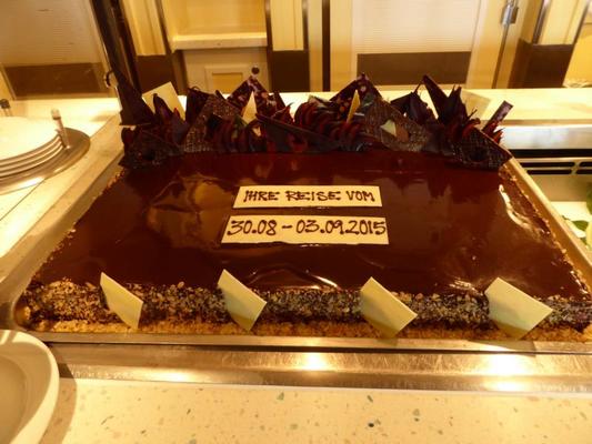 127 Mitarbeiter sorgen dafür, dass in den 3 Büffet- und 3 Gourmetrestaurants sowie im Crew-Speisesaal immer was leckeres auf den Teller kommt. Die Bäckerei arbeitet quasi rund um die Uhr. Ich wage es nicht auszusprechen: 4.000 Brötchen werden pro Tag verspeist. Ich habe bisher nur 2 gegessen, wer hat die anderen vertilgt? Wenn Mutti diese Zahl hört, bekommt sie bestimmt auch so große Augen wie wir. Die Vorratsräume sind noch gut bestückt und so werden wir satt werden auf den letzten Seemeilen bis Hamburg.