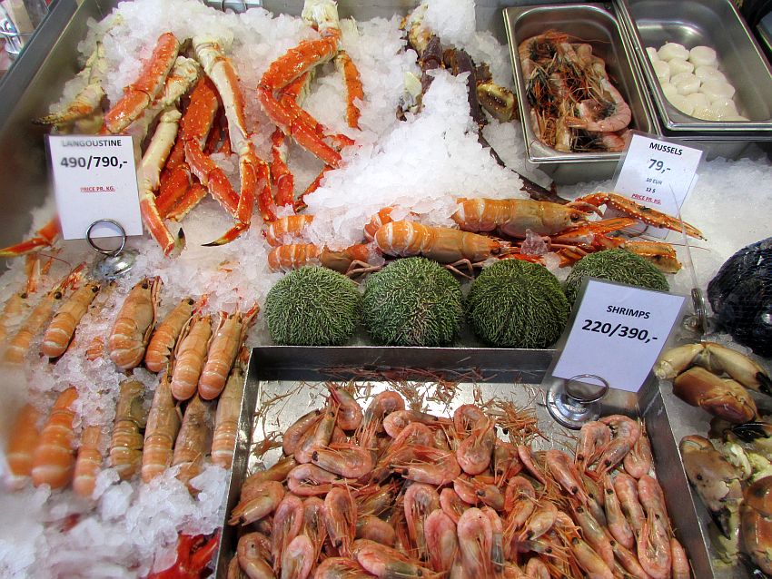 Ich habe noch ein paar mittlerweile ungültig gewordene Norwegische Kronen-Scheine, die ich in der Tourist-Information umtauschen möchte. Der Weg dorthin führt mich unwillkürlich über den berühmten Fischmarkt von Bergen, auf dem man neben jeder Menge Meeresgetier auch aus heimischen Früchten hergestellte Marmeladen und Obst der Saison kaufen kann.