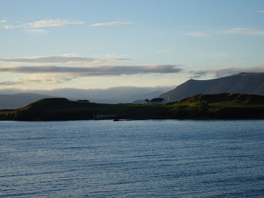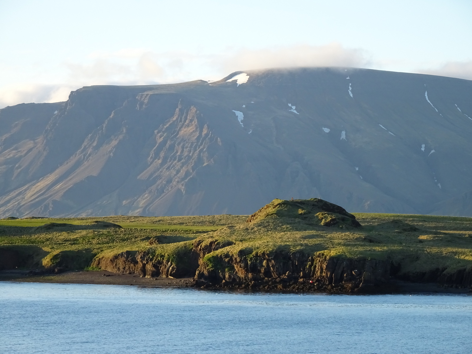 Schon beim morgendlichen Aufstehen übrigens haben wir Land erkannt. Mehr oder weniger ist jetzt also Island erreicht. Es sind schon mal, an der Südostspitze, die schneebedeckten Berge und die davor gelagerten kahlen Felsen der „Westmännerinseln“ zu sehen, von denen dann auch nur eine bewohnt ist.