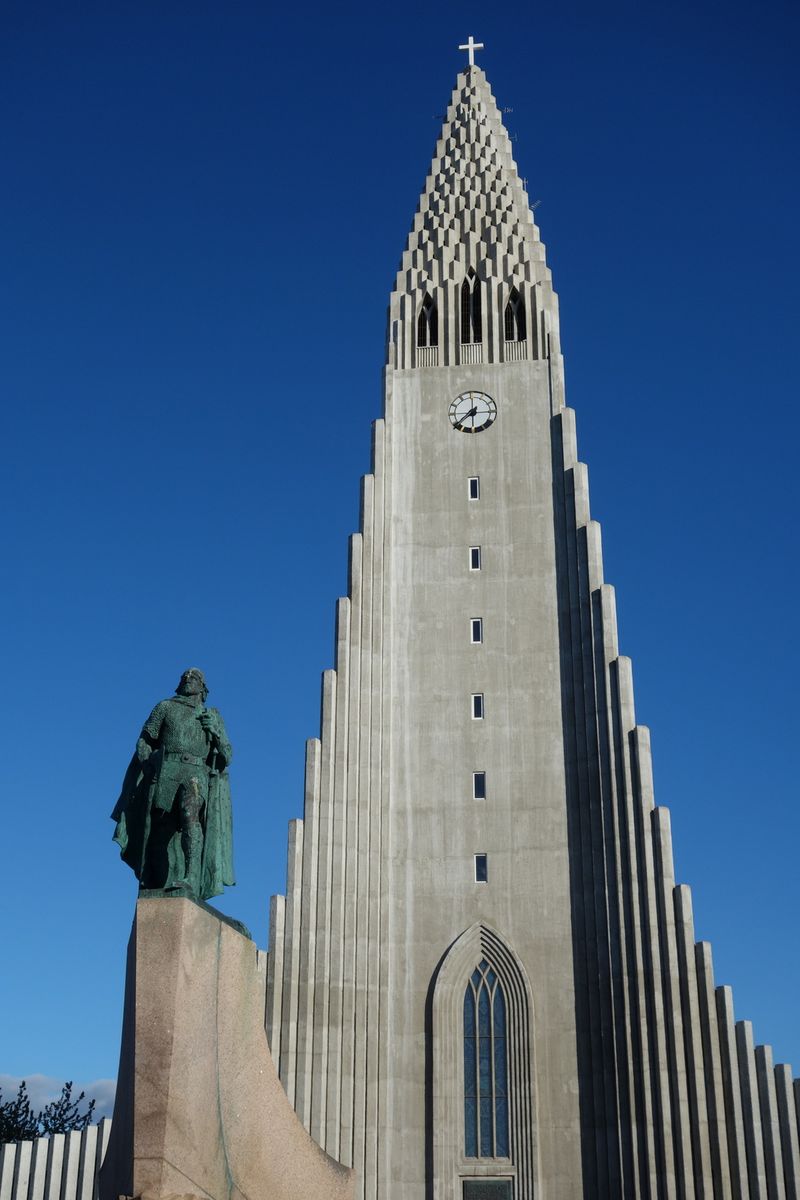 An deren Ende zeigt sich jetzt da oben die Hallgrimskirche im Ganzen. Die zackige Architektur des grauen Betons ist den oftmals stufenartig zerklüfteten Klippen Islands nachempfunden.
