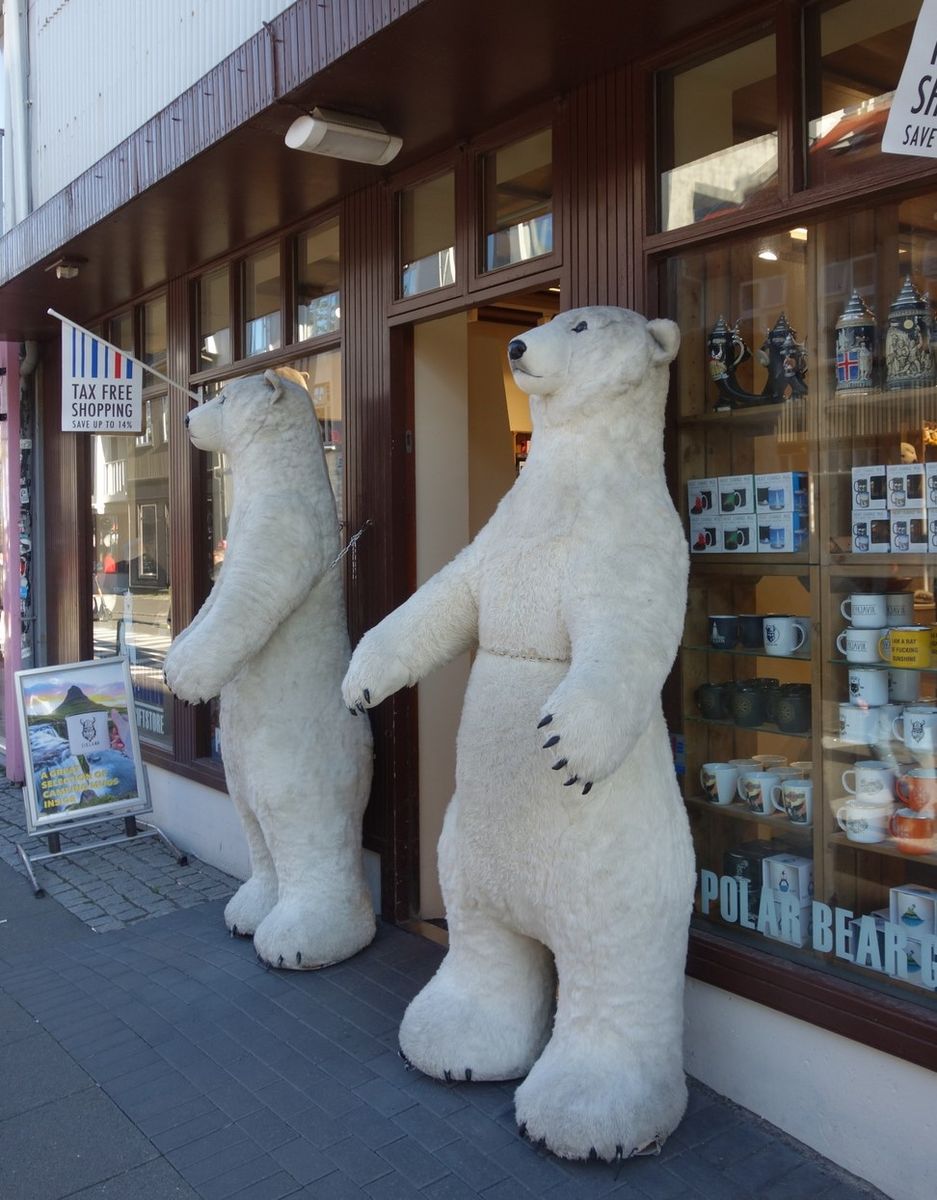 Und jetzt, mitten in der Einkaufsmeile, stehen wir plötzlich vor 2 großen Eisbären. Offenbar bewachen die den Eingang des Klimbimladens.