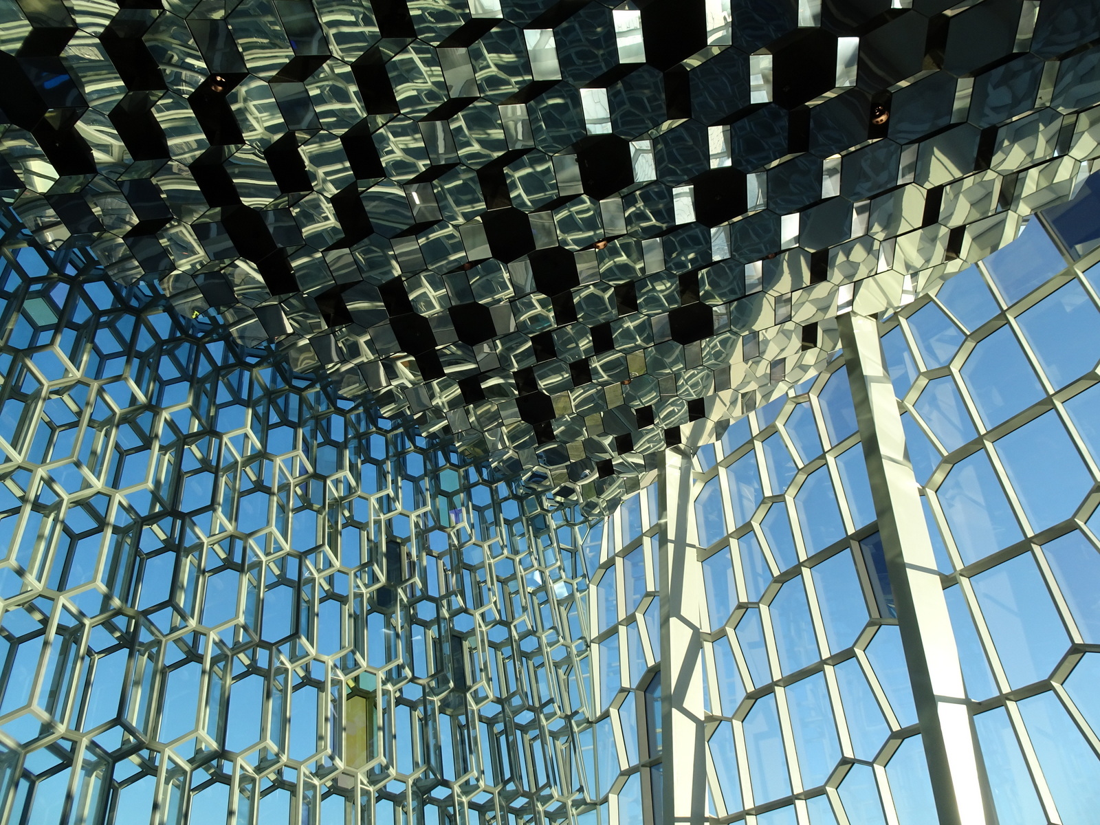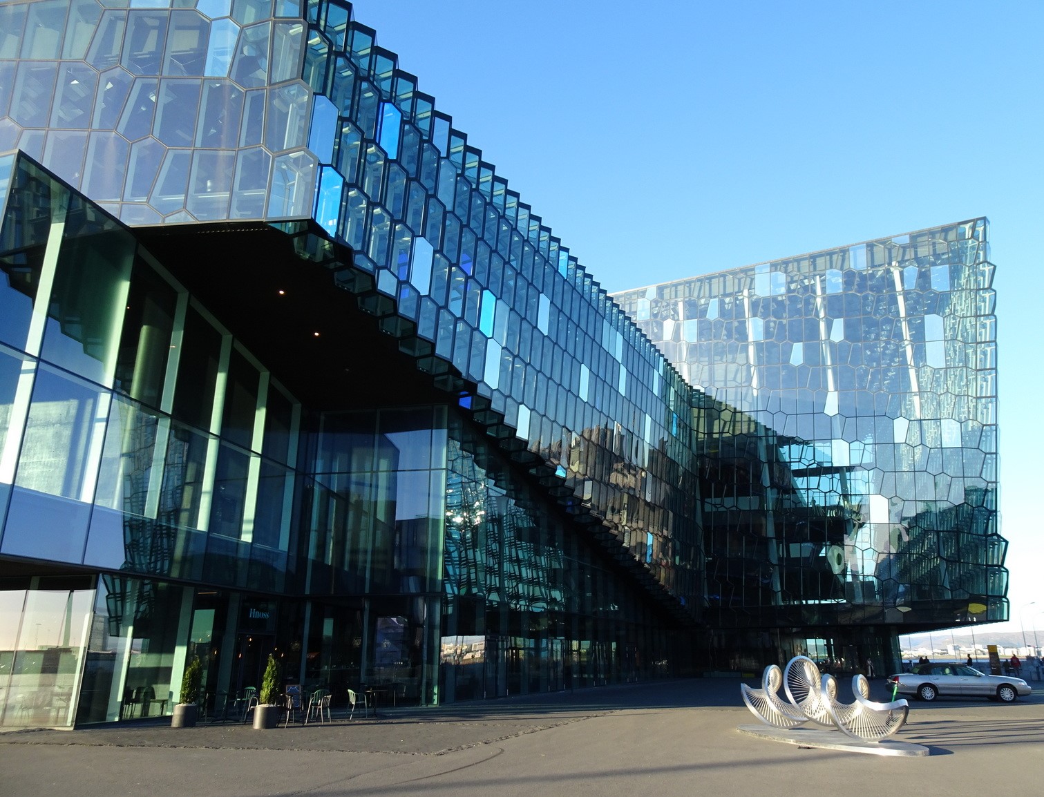 Diese „Harpa“ ist ein großes Bauwerk mit teils schiefen Wänden und ist mit hunderten Scheiben nahezu vollverglast. Je nach Lichteinfallswinkel und eigener Position wechseln einzelne Scheiben durch Reflektion die Farbe. Das ist schon raffiniert konstruiert, die Idee könnte von mir gewesen sein. Ist sie aber leider nicht.