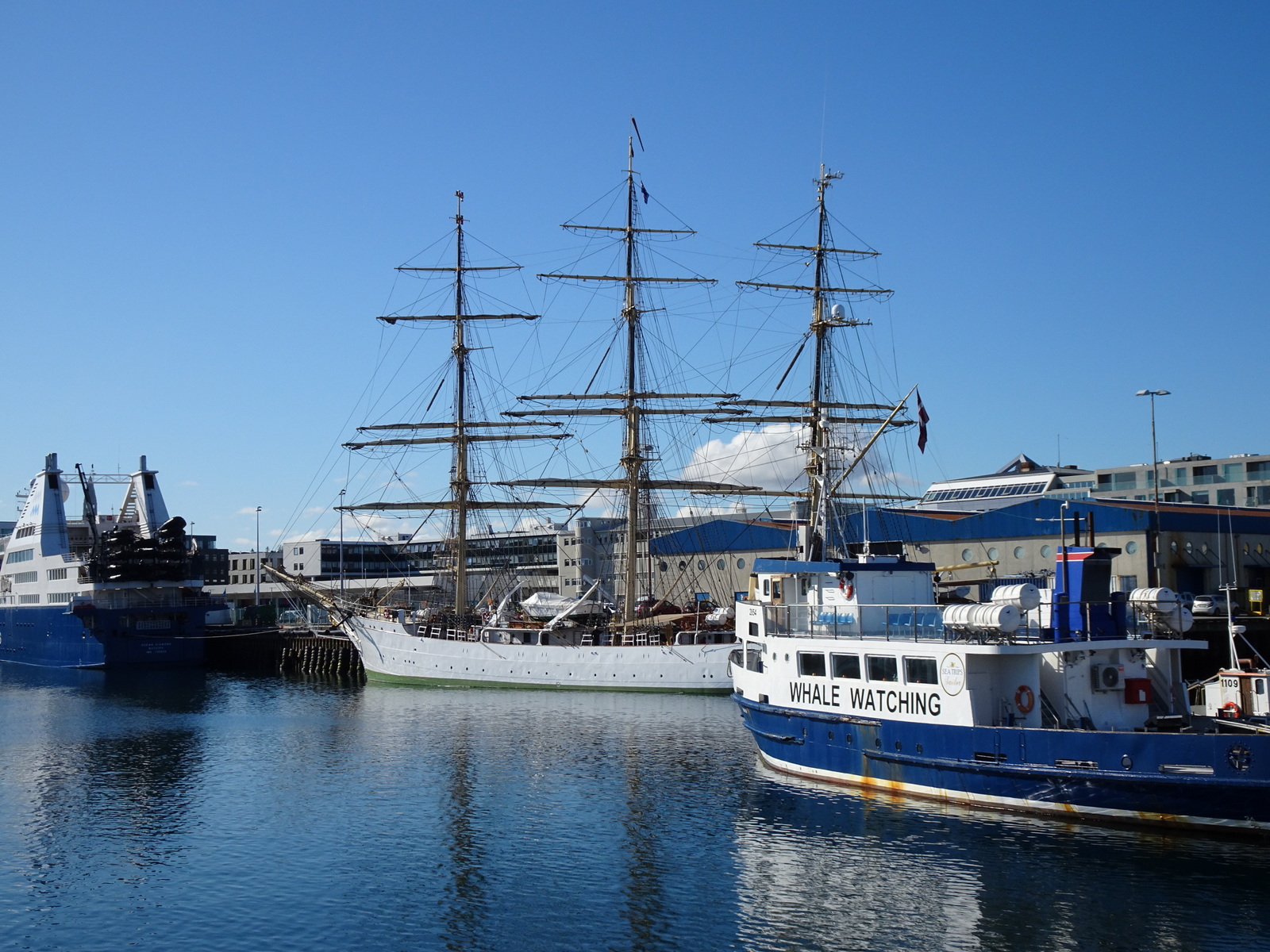 ein tolles auffälliges Holzhaus stehen. Obwohl ich es jetzt gar nicht mal so auffällig und toll finde, entdecken wir es recht schnell. Ist jetzt so ein Studenten-Kulturtreff drin. Hätte man sich jetzt drin aufwärmen können, denn seit wir die Einkaufsmeilen verlassen haben weht uns hier zunehmend kalte Luft durch die unbekleideten Stellen des Plüschfells. Lieber aber zurück Richtung Bushaltestelle, denn da müssen wir ja noch den „Alten Hafen“ und die Harpa, also die Konzerthalle abklappern. Den alten Hafen aber habe ich mir jetzt irgendwie heimeliger vorgestellt. Aber wenigstens entdecke ich schon mal ein Boot mit der Aufschrift „Whale-Watching“ und da ich vermute, dass es unser morgiges Expeditionsboot sein könnte, halte ich im Vorbeigehen schon mal Ausschau nach strategisch vermeintlich günstigen Beobachtungsplätzen.