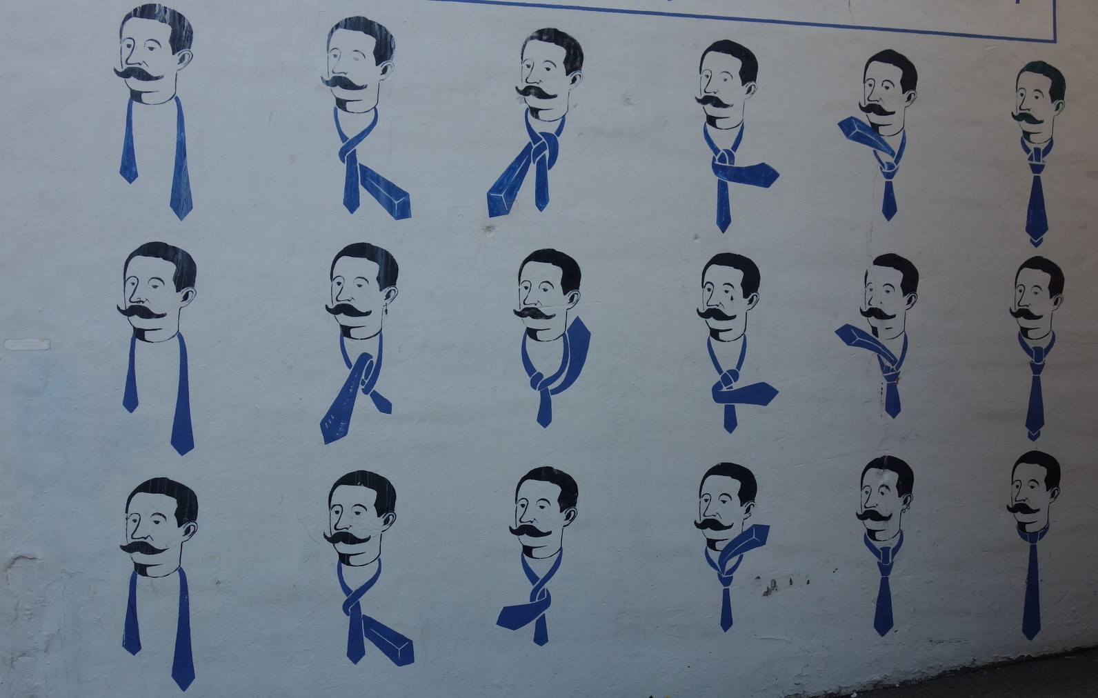 Und wenn es plötzlich mal etwas feiner sein muss, man z. B. von einer solchen Einladung gar überrascht wird, gibt es auf der Hauswand sogar noch Anleitungen zum Binden der Krawatte...
