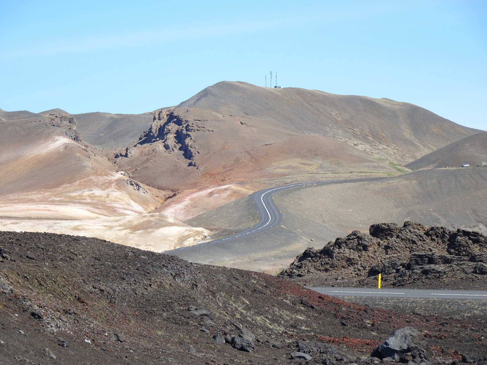 Die haben in manchen Gegenden Islands so viel von dieser Geothermik, dass es manchmal sogar beheizte Straßen geben soll. Eigentlich ja ganz praktisch im Winter… Wenn man andererseits auf insbesondere den Bergstraßen so viel Schnee hat, dass die Begrenzungspfosten nach oben verjüngt sind, damit man notfalls noch einen weiteren Pfosten draufsetzen kann.