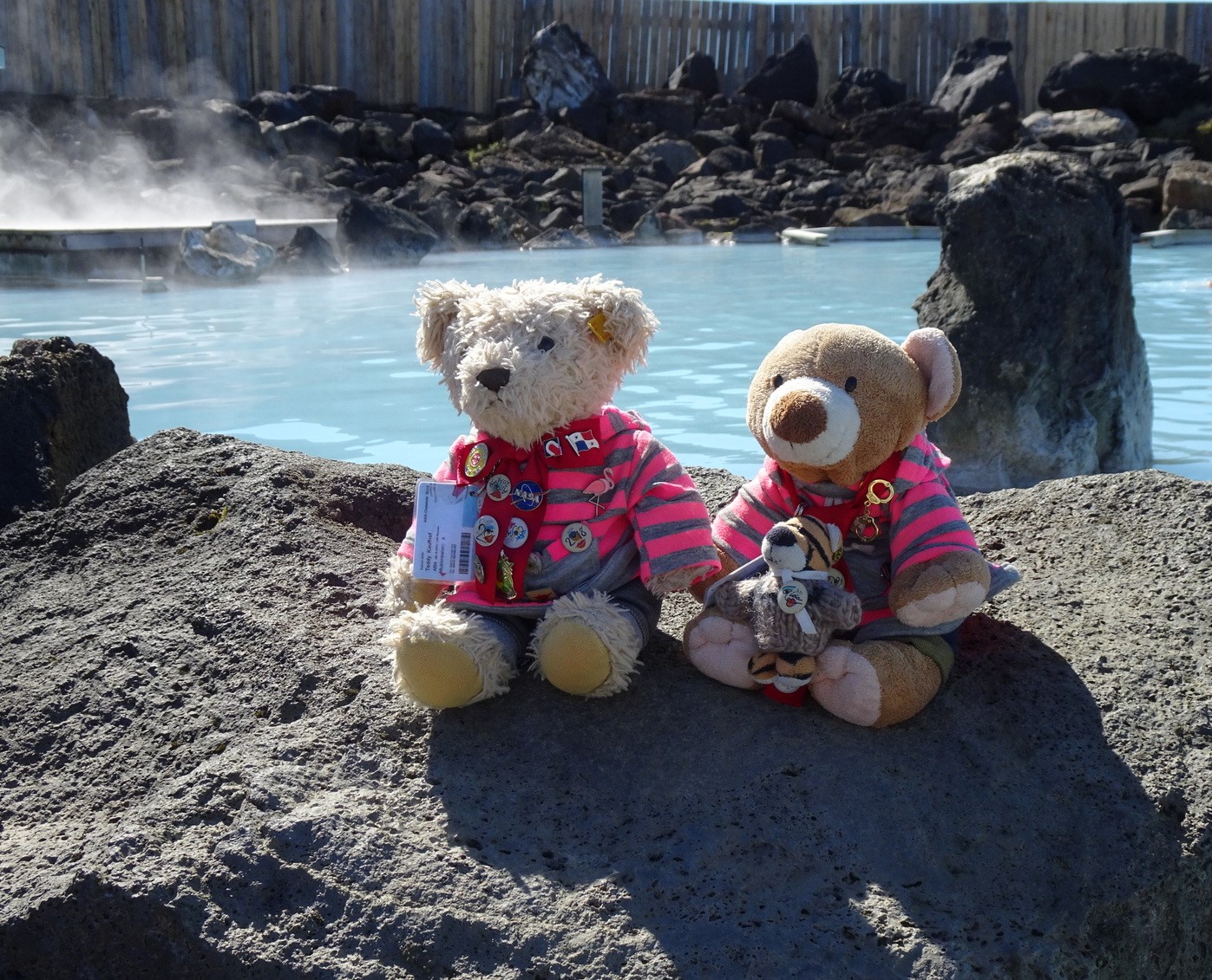 Tatsächlich gibt es im 35 bis 40 Grad warmen Wasser wohl merklich heißere, wie „kühlere“ Stellen, manchmal nur einen Meter voneinander entfernt. Bei 35 bis 40 Grad müssen die aber weder Angst vor Frösteln, noch vor Verbrennungen auslösen. Was zunächst eher irritiert, dass ist dieser Geruch der mineralien- und schwefelgeschwängerten aufsteigenden Dämpfe. Aber soll ja wohl gesund und ein wahrer Jungbrunnen sein. Vorweg nehme ich mal, dass ich das später nicht so direkt erkennen kann, eigentlich gar nicht… Gefallen hat es denen aber auf jeden Fall. Und auch nur 3 winzigste schwarze Mücken haben die gesehen. Wenn wir irgendwann nochmal nach Island kommen, dann wollen sie daher mal die „Blaue Lagune“ testen.