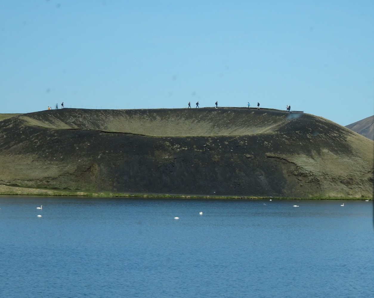 Den Namen hat er von den Mücken. Übersetzt heißt Myvatn eben „Mückensee“. Und der interessierte weltgewandte Teddy hat sich da mal informiert, warum die Mücken solch einen Spaß an diesem See und der Umgebung haben. Spaß haben die tatsächlich an dem hier und da austretenden Kohlendioxid. Und es gibt Zeiten, da sieht man Stellen wo richtige schwarze Säulen aufsteigen. Das sind dann Mücken, ganz konzentriert an einer Stelle. Wie gerade jetzt. An einigen solcher Stellen fahren wir vorbei. Und an den vielen Mücken haben auch z. B. die Fische und Enten Spaß. Daher ist die Gegend so dermaßen artenreich, mit allein 15, z. T. seltenen Entenarten. Spaß haben jetzt auch wir an der ganzen tollen Gegend hier und so schließt sich der Kreislauf. Geschützt durch die Busscheiben, können uns die Mücken diesen Spaß auch nicht verderben. Obwohl es aber zumeist ohnehin eine harmlose Art, die „Staubmücke“ ist. Aber wohl nicht immer… Und deshalb machen wir uns jetzt aus dem Staub.