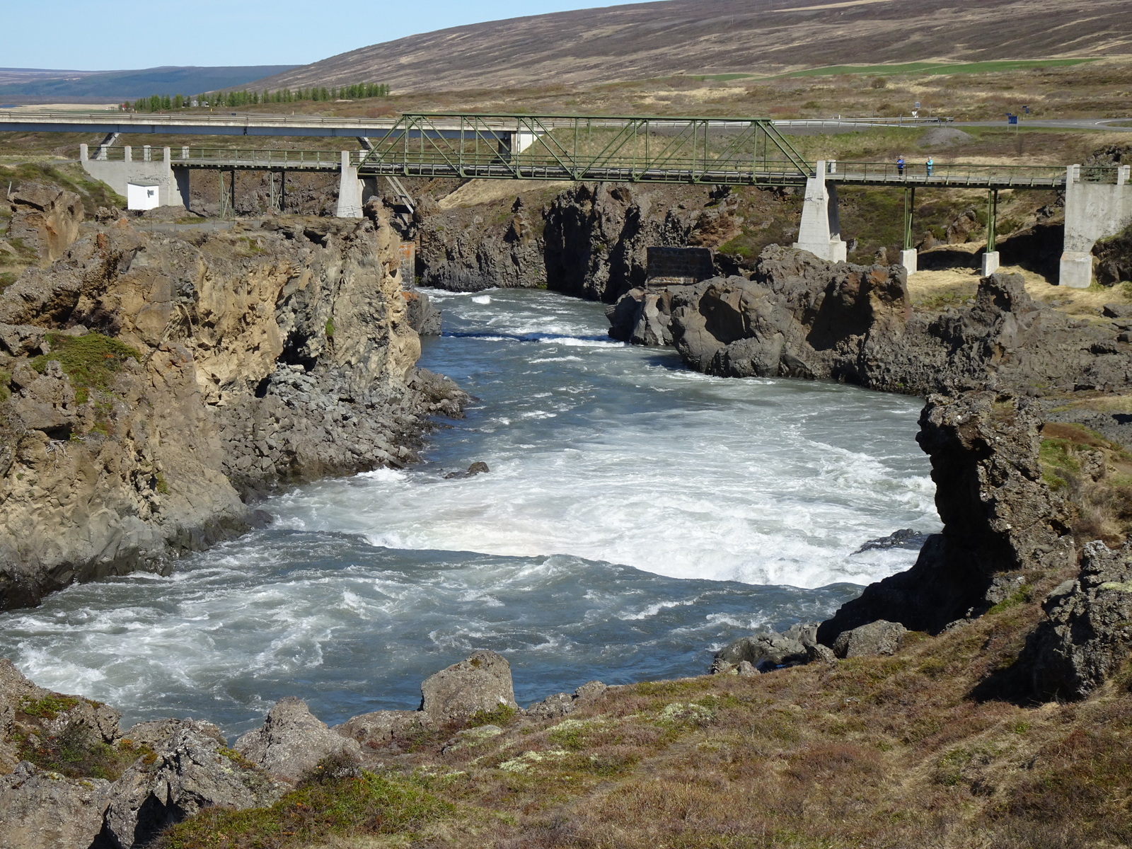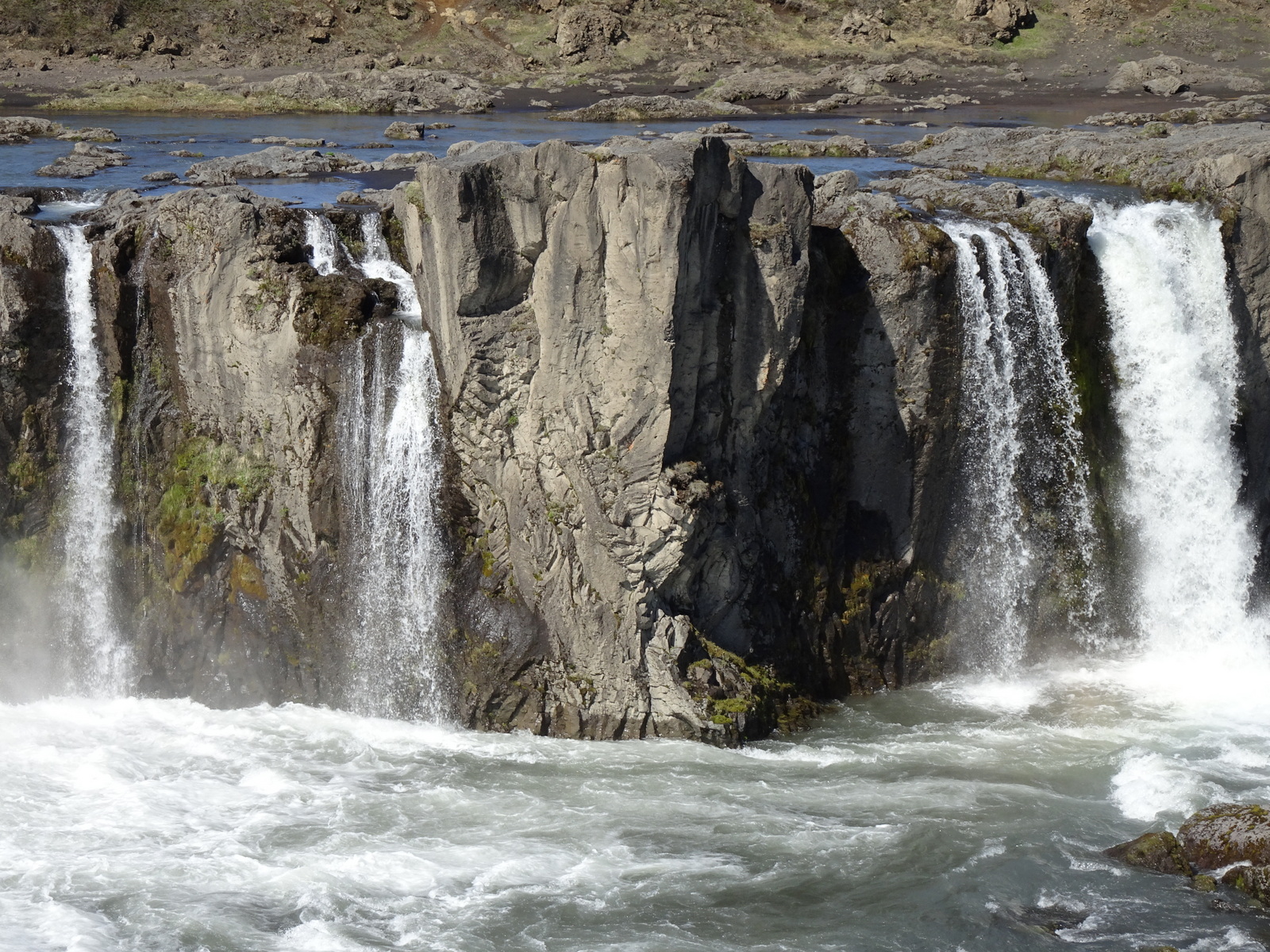 dieser Fluss mit dem komplizierten Namen, den ich aber sowieso nicht behalten brauche. Denn den Namen hat die Sache hier von einem angeblichen Ereignis. Frisch zum Christentum bekehrt, soll ein Häuptling oder sonst so ein Stammesboss, Bilder und Statuen seines früheren Glaubens in das aufgewühlte Wasser geschmissen haben. Ob das nun stimmt oder nicht, Beweise jedenfalls kann ich im Wasser nicht liegen sehen, heißt das hier daher „Goda“ für Götter und „Foss“ für Wasserfall, also „Götterwasserfall“.