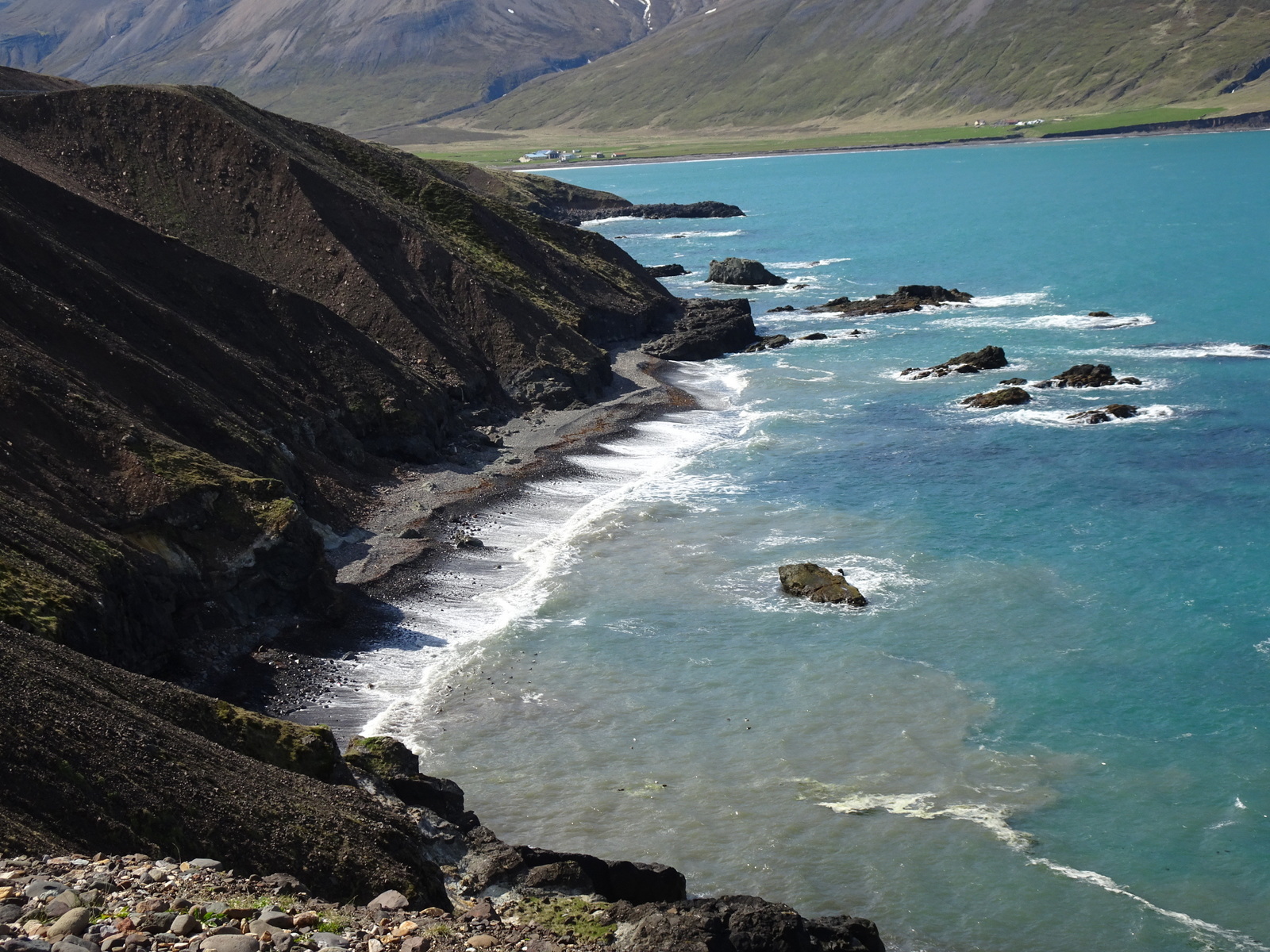 Wir unterdessen im Bus haben jetzt unseren Mittagsschlaf beendet und nun geht es retour. Auf dem selbem Wege, also auch wieder den steilen Küstenabschnitt „Njardvikurskridur“ entlang,