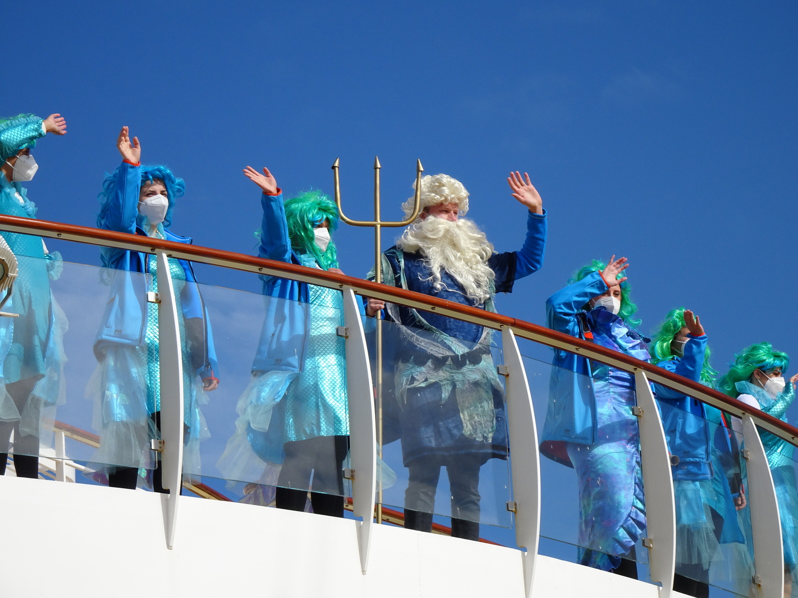 Neptun ist aus den Tiefen des Meeres an Bord gekommen und sein Gefolge serviert den Täuflingen jetzt einige komische versalzene Sachen. Nur den stinkenden Fisch müssen die diesmal wohl nicht küssen. Das fällt aus, wohl wegen Corona. Satt geworden sind sie wohl nicht, aber ne Urkunde mit so komischen ellenlangen neuen Namen wird nun den heimischen Treppenaufgang zieren. "Madagaskar-Ährenfisch"und "Diamantenregenbogenfisch".