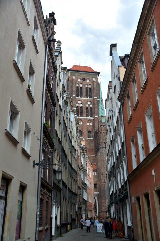 Aber keine Angst – es war alles abgesichert! Auch die Plattform in Höhe der Glockenaufhängung. Zu unserem Glück ertönte während unserer Turmbesteigung nicht die große Glocke Gratia Dei, auch die kleinere Glocke Ave Maria hielt sich zurück. konnten wir langsam, aber sicher nach oben kommen und dort – auf dem Aussichtsrundgang – begann das große Staunen! Vor uns die drei kleinen, schlanken Nebentürme der Marienkirche, die von hohen Häusern begrenzte Frauengasse mit dem Frauentor am Ende, links daneben die Heilig-Geist-Gasse, deren Häuserfronten von hoch oben prima bewundert werden konnten, das Krantor von hinten und die Motlawa, an deren Ufer Segelschiffe lagen.