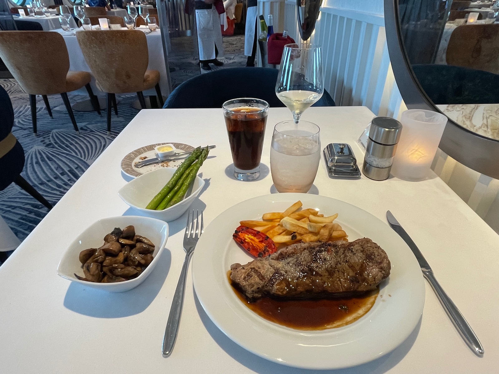 Essen hatte ich heute Abend für das Commodore einen Tisch reserviert. Es gibt zwei inklusive bedienrestaurants. Das hudson und das commodore. Beide haben die gleiche Karte. Das Hudson ist das grössere restaurant am Heck was die Glasscheibe ringsum hat und wohl das beliebtere ist. Hudson ist weiter unten mit grossen Bullaugen. ncl stellt hier nun auf eine gleichbleibende Karte um. Früher war es ein mix aus gleichem und was anderes. Bei ncl sind aber die Spezialitätenrestaurants sehr beliebt und wenn man mit free at sea nicht nimmt man da was dazu oder wenn man latitudes member ab einem gewissen Rang ist. Ich habe für meine Reise 3 Spezialitätenrestaurants dabei von free at sea. ( die haben es danach umgestellt und jetzt sind es teils weniger, hängt immer von der Reise und Kabine ab ) ich werde bei meiner Reise vermutlich nur 3 mal in einem der hauptrestaurants essen ( auf die ersten 10 Tagen bezogen)