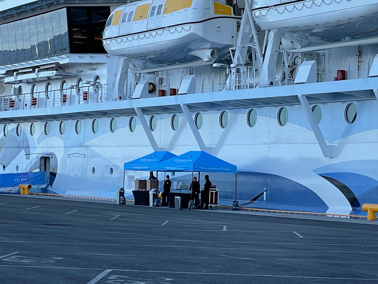 Bei ncl üblich, wenn das Wetter nicht gerade total blöd ist, ein Stand am Schiff mit erfrischenden Handtücher und Kleine Erfrischung zum trinken.