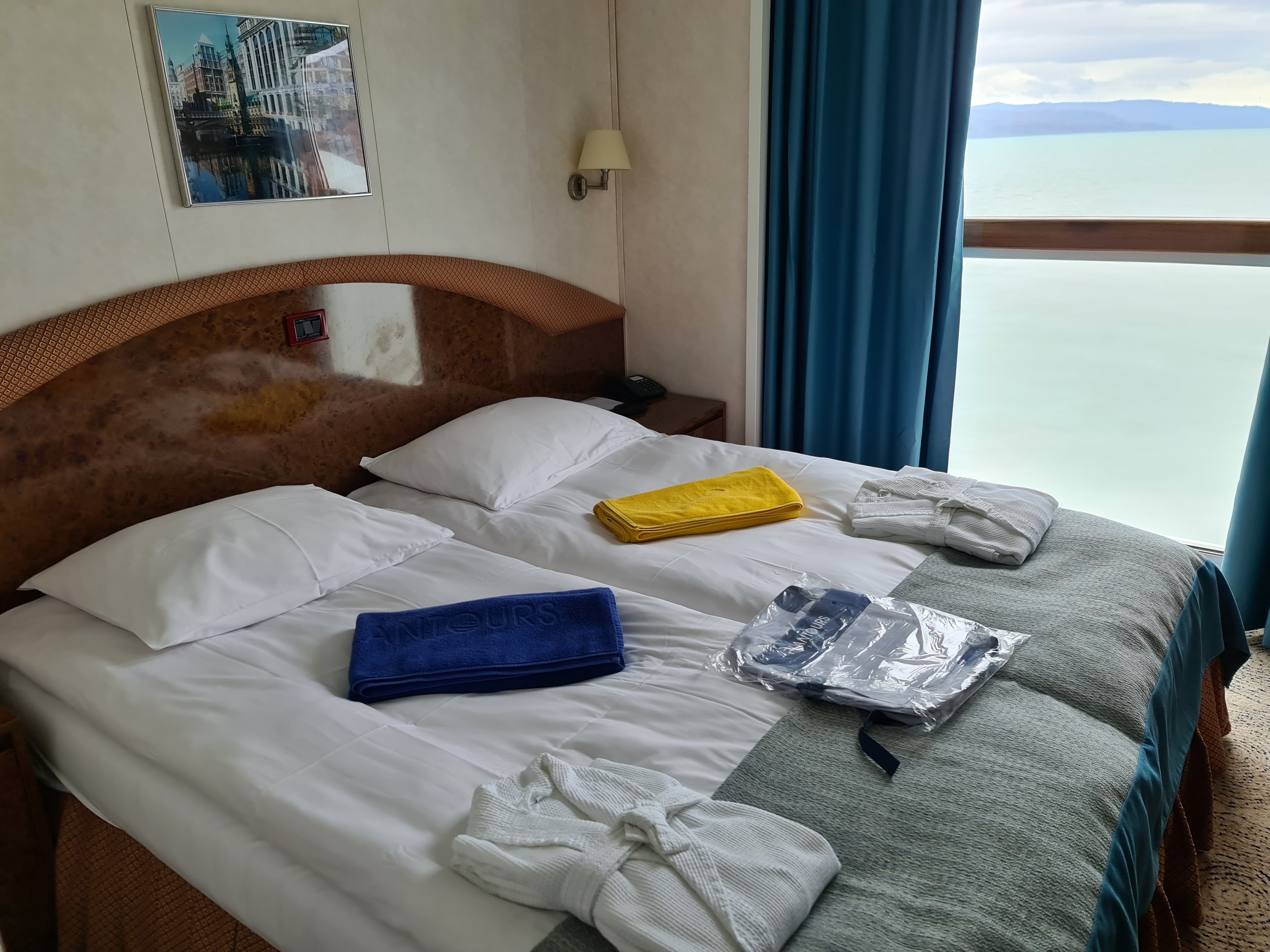 Die Check-in Prozess lief reibungslos (zuerst Abgabe der Medizin-Bogen, dann Covid-Test, 15 Minuten in der Lounge warten, schließlich die Freigabe, die Übergabe der Kabinenkarte und dann, 19 Stunden nach unserer Abreise zu Hause und 13,5 Stunden nach der geplanten Abflugzeit waren wir endlich auf unserer Kabine angekommen.