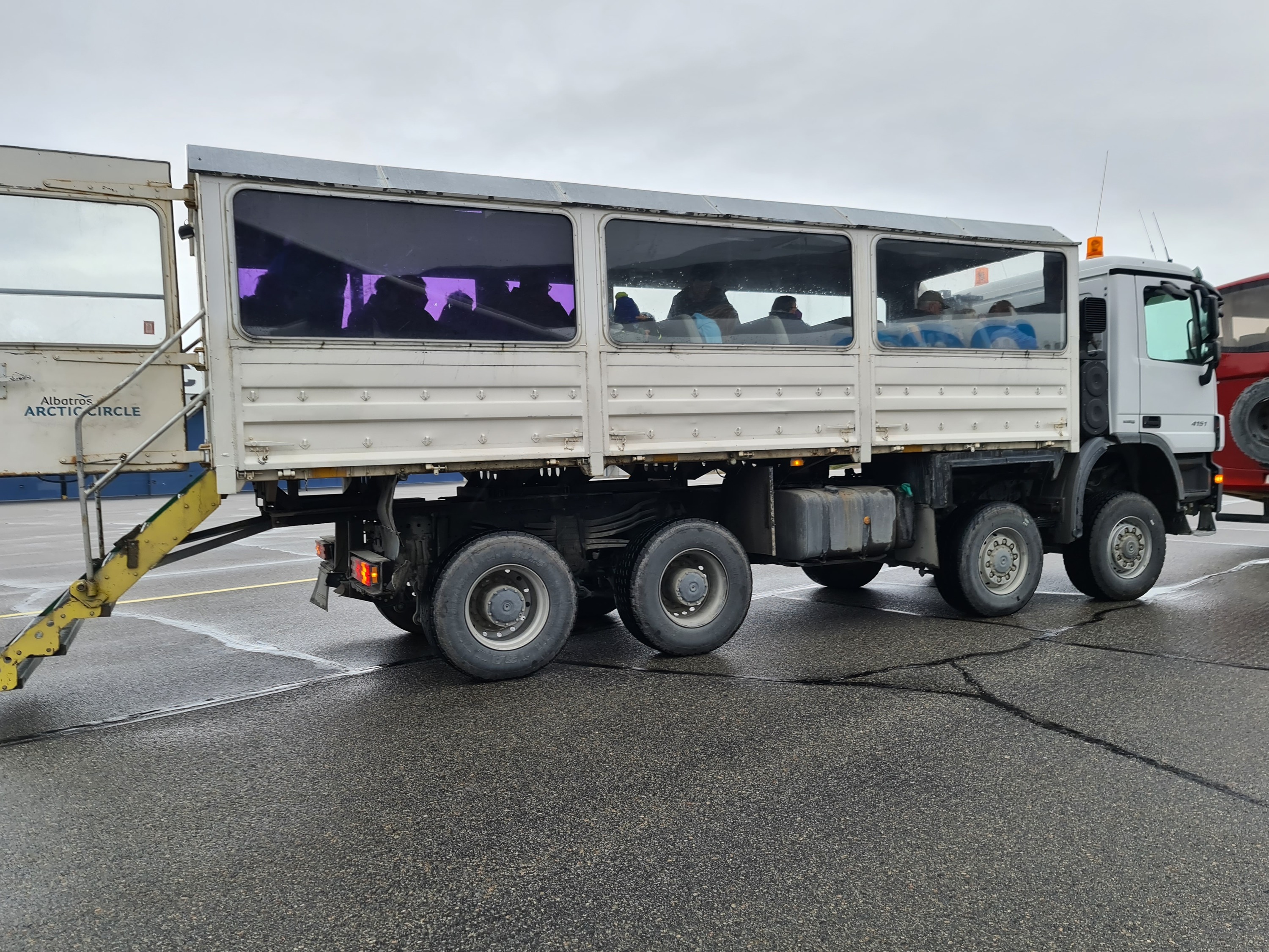 Nach Zeitumstellung von 4 Stunden landeten wir um ca. 10.00 Uhr in Grönland. Dort angekommen standen bereits auf dem Rollfeld Busse oder LKWs mit Sitzen bereit.
