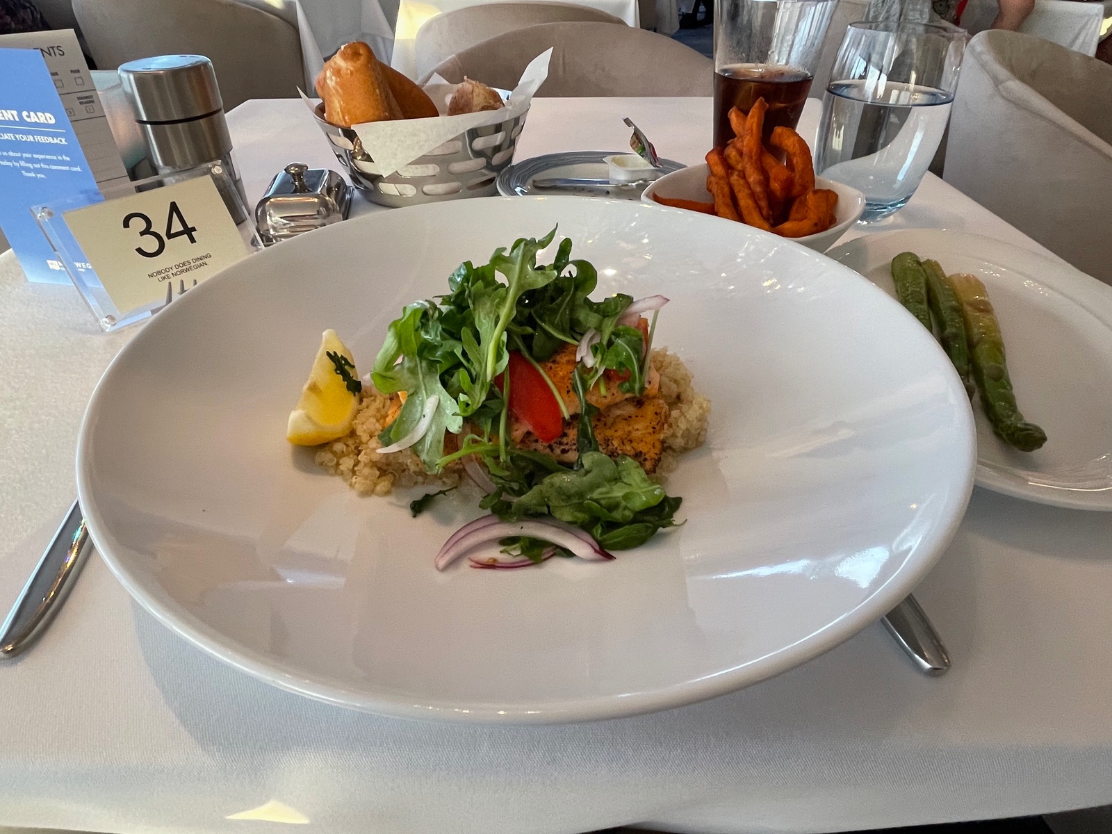 Hatte Lachs und zudem als extra Beilage grünen Spargel und süsskartoffel Fries. Als Vorspeise ne asiatische Nudelsuppe sowie den Hot chocolate lava cake als dessert.