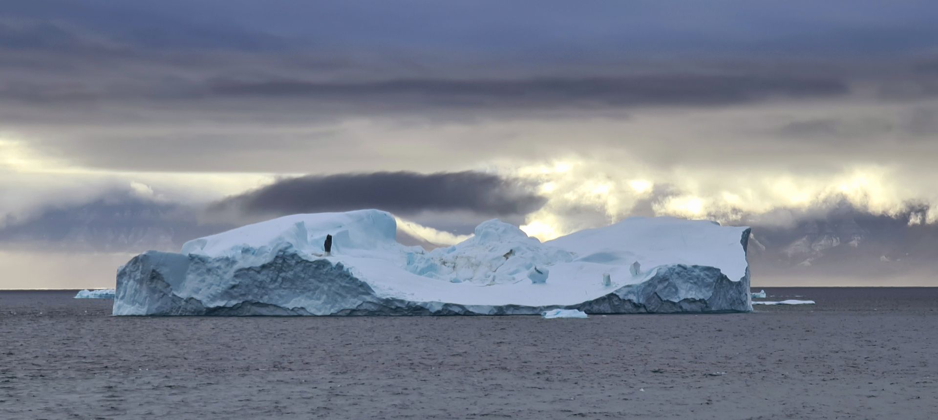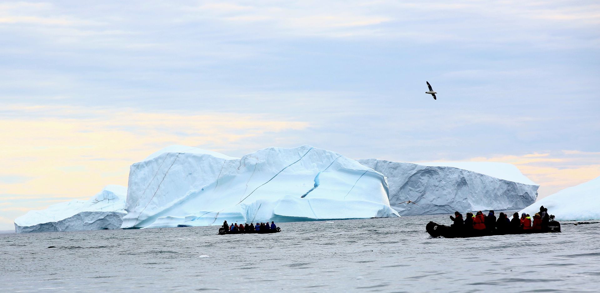 Warum man hier so eine seltsame Einteilung vornahm und nicht gleich die Leute zu einer 16-er Gruppe zusammen einteilte, weiß ich nicht. Die Fahrt war aber interessant, aus dieser tiefen Schlauchboot-Perspektive wirken die Eisberge nochmal heftiger. Auch einen schönen Blick aufs Schiff kann man genießen, wobei das Fotografieren nicht so einfach war. Entweder hatte man die Leute von gegenüber mit auf dem Bild oder musste sich in den unhandlichen Winterklamotten vorsichtig an den Sitznachbarn vorbeidrehen, um nach hinten zu fotografieren.