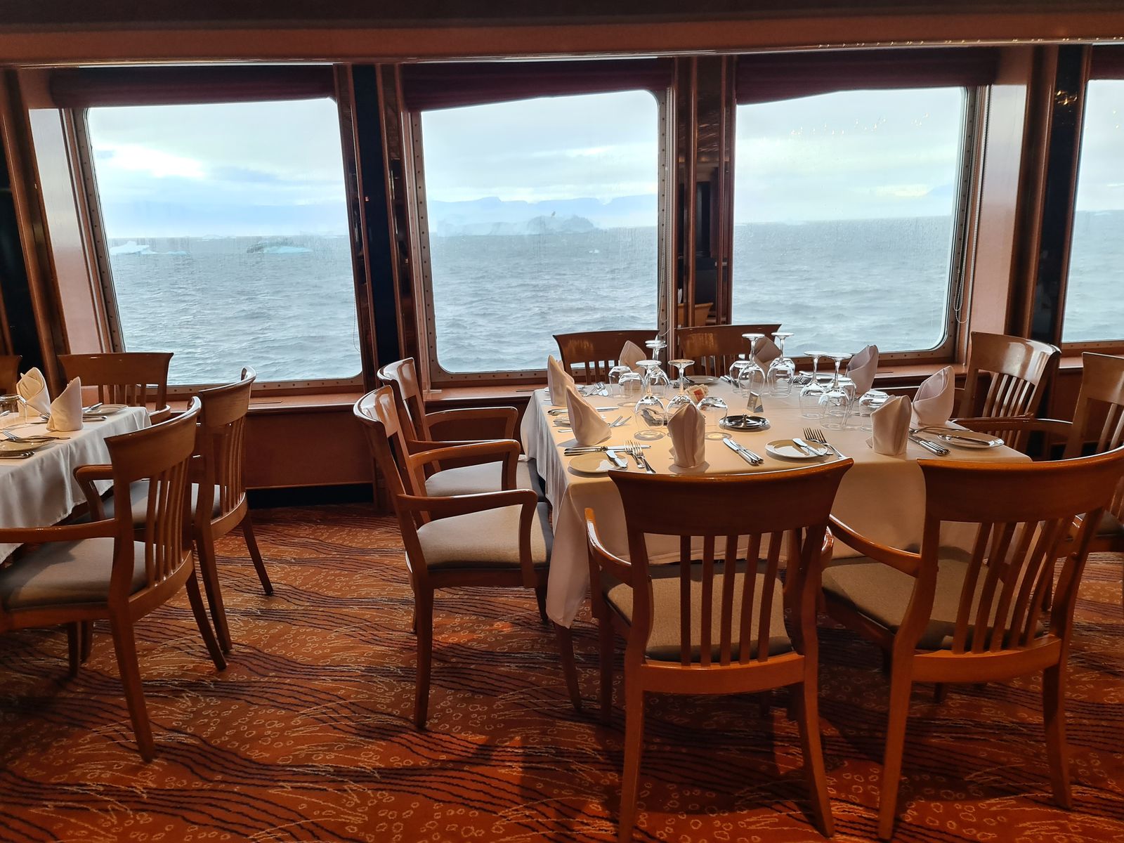 Vorher wollte ich gefrühstückt haben. Um 6.30 Uhr schaute ich aus dem Fenster. Ich sah durch den Nebel links einen Berg und rechts einen Berg, dazwischen nichts. Ich ahnte, dass da wohl die Gletscherkante sein könnte. Kanal 1 im Fernsehen zeigt die Bugcam, auf der sich ein ähnliches Bild ergab. Kanal 2 zeigt die Route, die wir gerade fahren. Wir waren tatsächlich schon recht nah am Gletscher, aber das Schiff schien zu wenden. Ob es sich einen guten Ankerplatz sucht? Aber was jetzt? Wir fahren zurück, weg vom Gletscher? Wir ahnten nichts Gutes und gingen erstmal frühstücken.