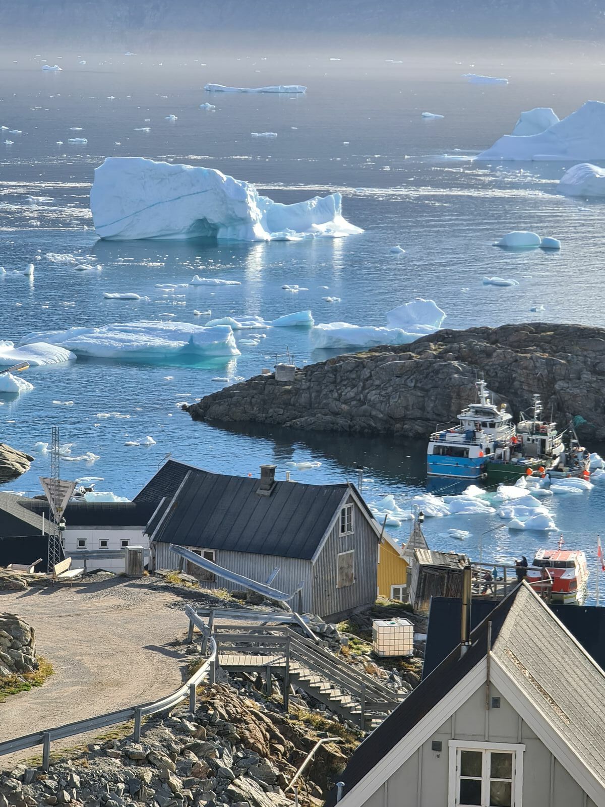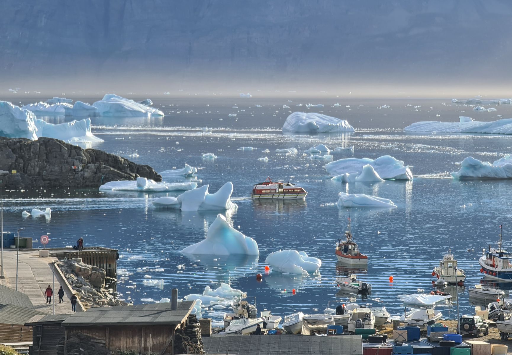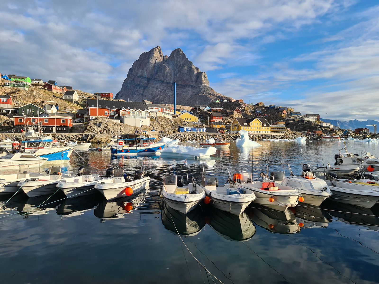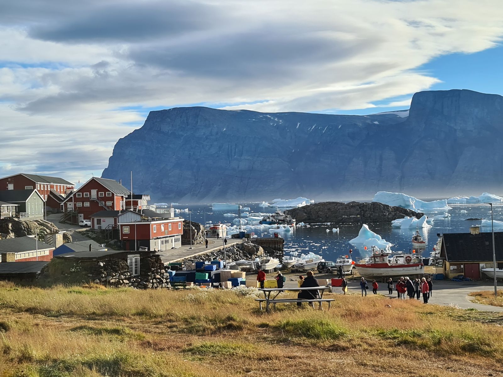 Der Tenderverkehr war nach den am Vortag vergebenen Farben geordnet. Wir waren diesmal in der zweiten Gruppe. Da aber für die erste Gruppe nicht genügend Leute zusammenkamen, die so früh schon tendern wollten, konnten wir sogar schon mit dem ersten Tenderboot an Land fahren. Dort erwartete uns bereits Herr Dr. Feldmann, der uns einige Informationen gab, bevor wir den Ort auf eigene Faust erkundeten. Die Lage vor dem Berg mit dem kleinen Hafen, die Eisberge, die sich tummelten und ständig laut zerbarsten, die tollen Spiegelungen durch die Sonne und dazu die bunten Häuser am Hang machten den Ort zu einer Bilderbuchkulisse: