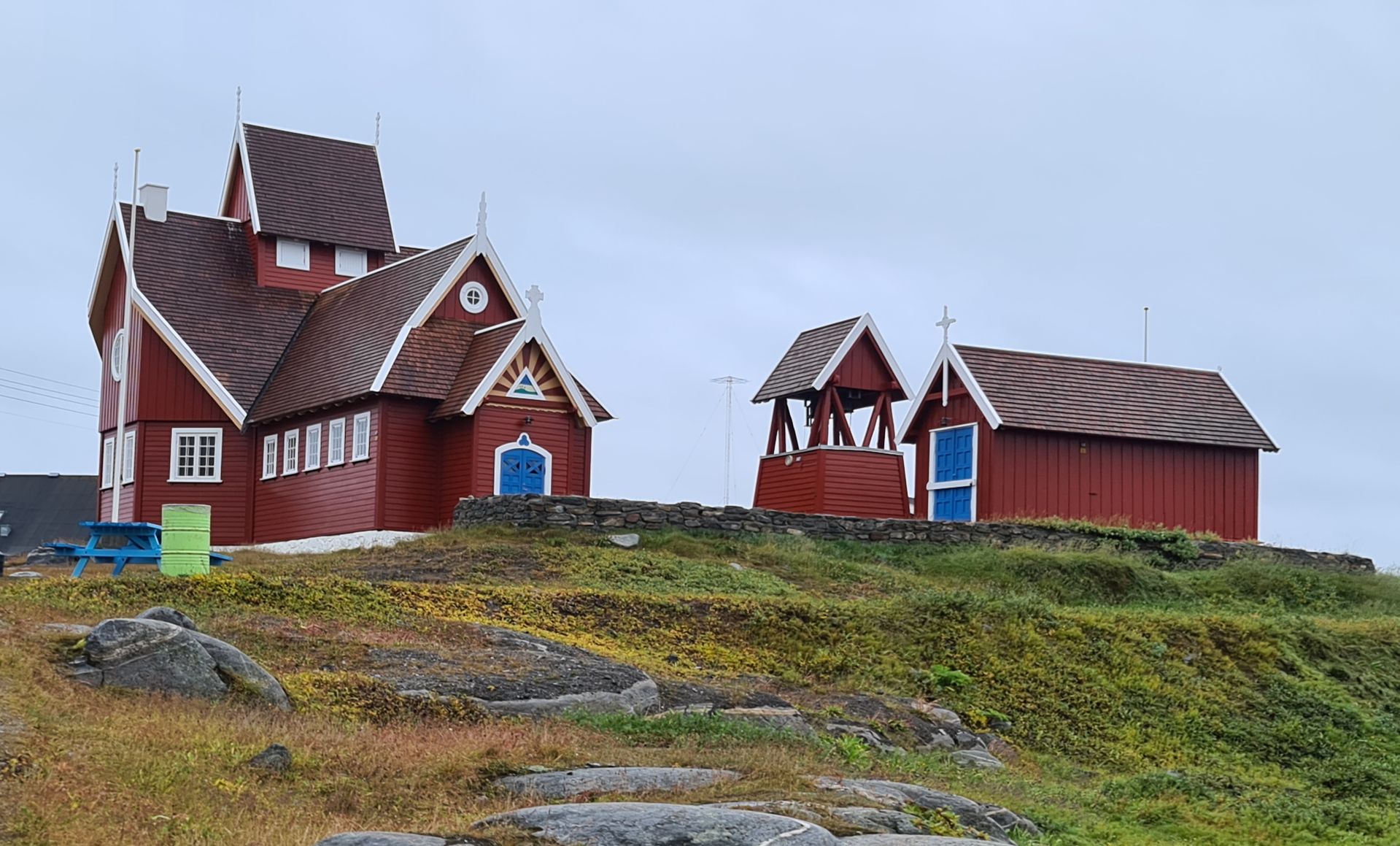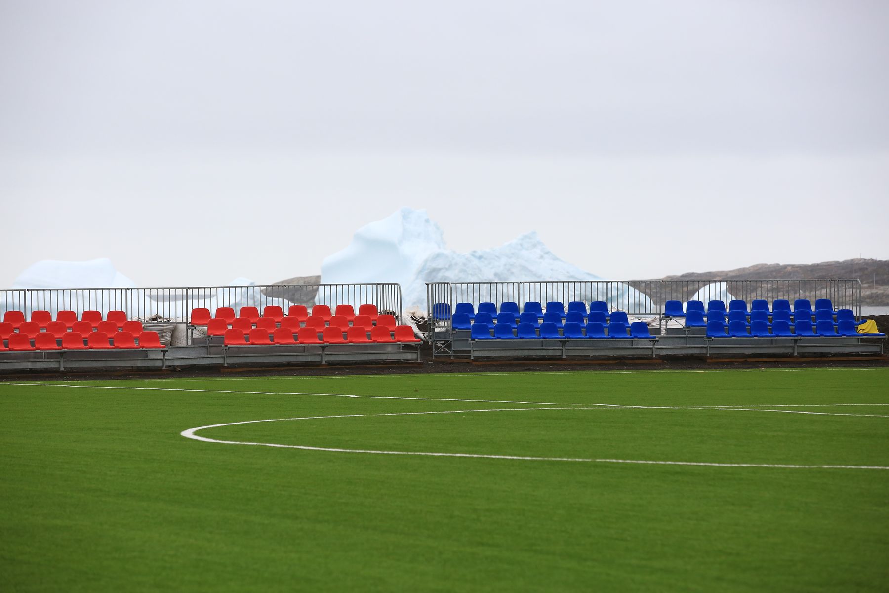 Anschließend gingen wir zum Kunstrasenplatz, den die Grönländer angelegt haben, um Mitglied bei der FIFA zu werden. Man sagte ihnen dann aber, dass sie ja zu Dänemark gehörten und von daher schon Mitglied der FIFA seien… Wie auch immer. Das Grün des Kunstrasens und die blau-roten Tribünen vor der Kulisse der Eisberge wirkte interessant.