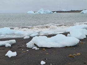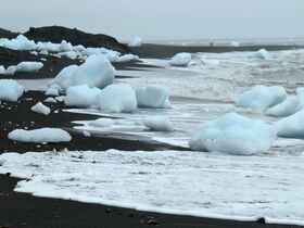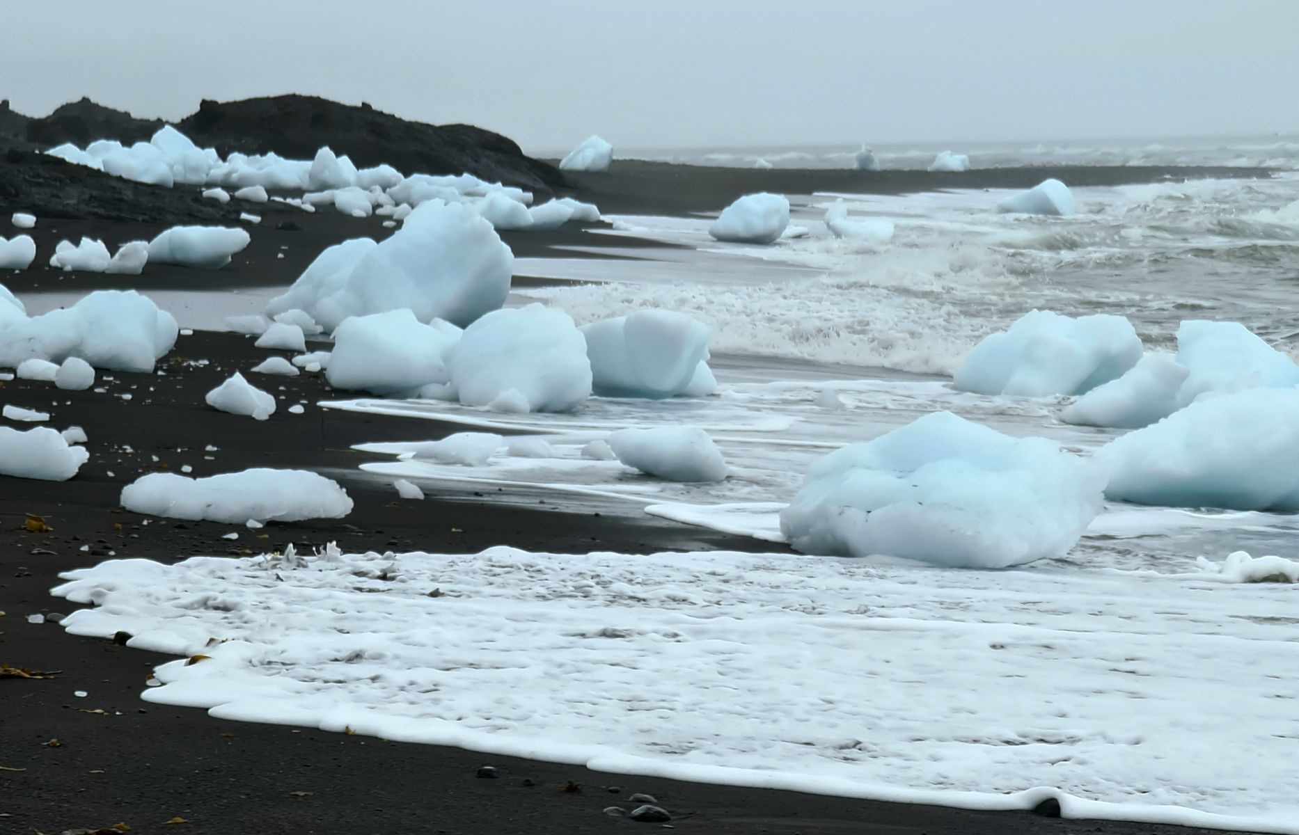 Wir liefen zuerst zum „Diamond-Beach“. Auf dem schwarzen Strand werden (genau wie am Jökulsarlon in Island) Eisabbrüche aus dem Meer an Land gespült. Das sieht teilweise sehr faszinierend aus, vor allem, wenn die Sonne darauf scheint. Nur an Sonne fehlte es mal wieder, es war sehr trüb und der Regen eine Frage der Zeit.