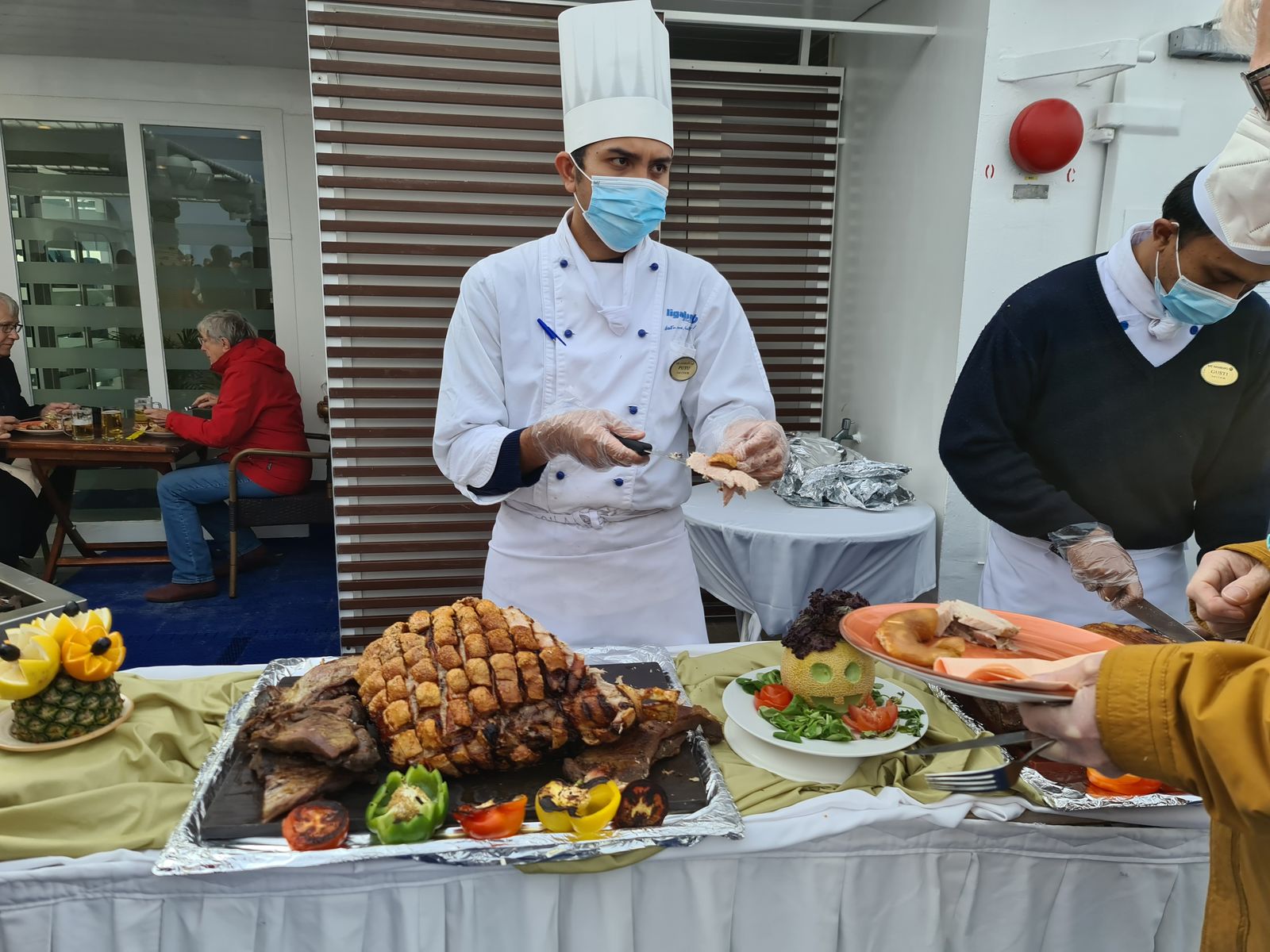 Um 11.30 Uhr folgte ein Musikalischer Frühschoppen auf dem Pooldeck. Es gab Freibier, Weißwürste, andere Würste, Krustenbraten, Kartoffelsalat, Kraut etc. Dazu spielte der Trompeter. Es war herrlich.