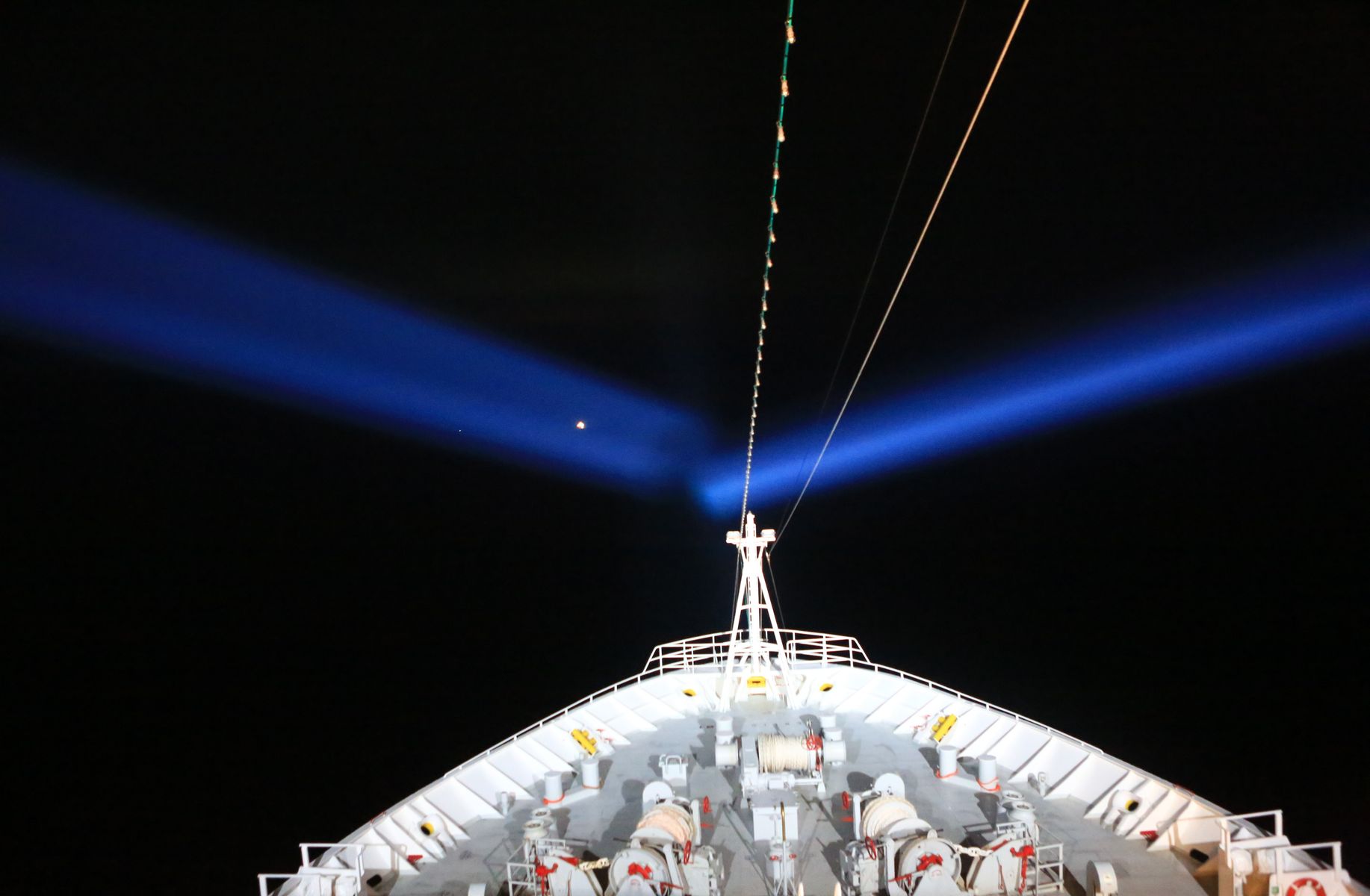 Auf diesem Bild sieht man die Bugstrahler, mit dem die Brücke Eisberge erkennen kann.