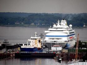 Für mich wurde es Zeit, das Stilleben (Floppymanns und meine Kamera, diverse Sonnenbrillen, Notizbuch, Floppys Oekotasche als Andenken an unsere Spitzbergentour) unseres besetzten Tisches in unmittelbarer Nähe der Reling zu verlassen und in das Schiffsinnere zu verschwinden. Auf unserer Kabine war eine noch volle Flasche Schampus versteckt. Die gelungene Kanaleinfahrt war doch ein Grund, zehn Gläser zu füllen und auf uns sowie die leider dem Ende zugehende Kreuzfahrt anzustoßen. Stimmt, zehn Gläser … Wir konzentrierten uns allerdings nur kurz auf das Prickelwasser, denn das Erlebnis „NOK-Fahrt“ wollten wir auskosten. Noch konnten wir die Schleusen erkennen. Aber kurz darauf lockte uns ein Dreimaster vor dem lang gestreckten Gebäude von Knierim Yachtbau, eine Werft, die High Tech Yachten von Weltformat baut.
