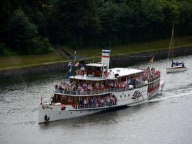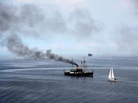 Dann war es so weit – die Heimat hatte uns wieder. Das zeigte sich, als wir um 13.05 Uhr am Marineehrenmal Laboe vorbeifuhren. Besonders in diesem Bereich war auf der Förde der Teufel los. Lag es daran, dass wieder ein schönes AIDA-Schiff zu Besuch kam? Egal, auf jeden Fall wurden wir kurz eingeräuchert. Die Dampfmaschine des Tonnenlegers Bussard qualmte uns ein und zog seine Runden.