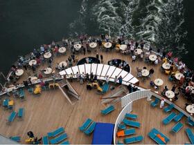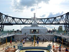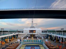 Direkt nach Beginn der Nautischen Stunde machte Kapitän Krüger zunächst klar, dass wir auf jeden Fall trotz der derzeit durchgeführten Schleusenreparaturarbeiten durch den Nord-Ostsee-Kanal fahren würden. Er hatte die Fahrtgeschwindigkeit so eingestellt, dass ein Erreichen der Kieler Bucht für ungefähr 14 Uhr geplant war. Prima – dann durften wir also den Kanal und dessen Umgebung sehr lange bei Tageslicht genießen! Und seine Aussage war der Hinweis, dass man so schnell wie möglich die unangenehmen Arbeiten wie Kofferpacken erledigen sollte, falls man sich den ganzen Nachmittag auf Deck aufhalten wollte. Wir packten … und waren so schnell wie möglich wieder auf dem Pooldeck. Rechtzeitig zum Poolbruch mit frischem Hering und Hawaii Bowle. Na ja – Bowle und Hering?! Musste nicht sein. Wir verzichteten auf Hawaii und schlugen bei den vielen, verschieden zubereiteten Heringssalaten soll zu! Der Andrang am Buffet – oder die Gier nach Bowle – war so stark, so dass es schwer war, einen Platz an der Sonne zu ergattern.