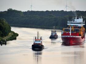 Nicht weit von der Kanalfähre Fischerhütte drosselte Kapitän Krüger die Geschwindigkeit. Wir wurden informiert, dass uns ein richtig großer Pott entgegenkam. Containerships VI, der sogar unter deutscher Flagge fuhr. Schiffe dieser Größenordnung bedürfen Unterstützung vorne und hinten