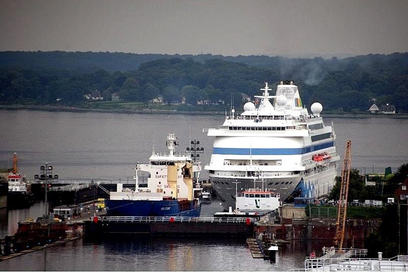 So, nun lag unser Schiff im Wassergefängnis. Vor dem Bug war alles versperrt, hinter dem Heck auch alles dicht. Aber immerhin – es war nicht allein … Dass Heizergruss diese Fotos schoss, ist klar. Aber nicht von der Aussichtsplattform direkt neben der Schleuse sondern von der Holtenauer Brücke. Der Kieler Heizergruss kannte sich sehr gut aus – kurz nach dem Anlegen in der Schleuse fuhr er zum Parkplatz – ich glaube an der südlichen Seite der Brücke – und eilte auf die Brücke. Dort bekam er in Poleposition mit, wie sich das Schleusentor öffnete, ein wenig später die AIDAcara alleine in der Schleusenkammer lag und sich bereit machte, in den Kanal zu fahren.