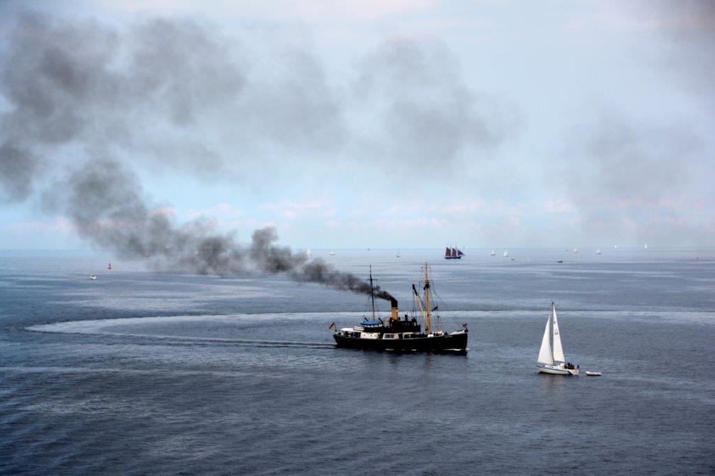 Dann war es so weit – die Heimat hatte uns wieder. Das zeigte sich, als wir um 13.05 Uhr am Marineehrenmal Laboe vorbeifuhren. Besonders in diesem Bereich war auf der Förde der Teufel los. Lag es daran, dass wieder ein schönes AIDA-Schiff zu Besuch kam? Egal, auf jeden Fall wurden wir kurz eingeräuchert. Die Dampfmaschine des Tonnenlegers Bussard qualmte uns ein und zog seine Runden.