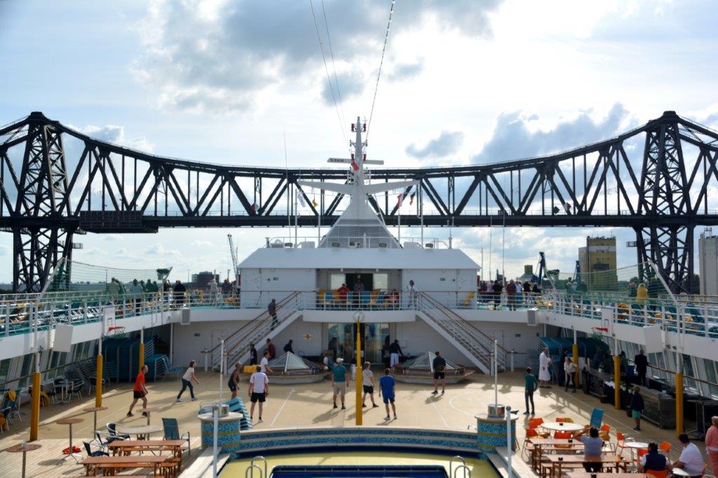 Direkt nach Beginn der Nautischen Stunde machte Kapitän Krüger zunächst klar, dass wir auf jeden Fall trotz der derzeit durchgeführten Schleusenreparaturarbeiten durch den Nord-Ostsee-Kanal fahren würden. Er hatte die Fahrtgeschwindigkeit so eingestellt, dass ein Erreichen der Kieler Bucht für ungefähr 14 Uhr geplant war. Prima – dann durften wir also den Kanal und dessen Umgebung sehr lange bei Tageslicht genießen! Und seine Aussage war der Hinweis, dass man so schnell wie möglich die unangenehmen Arbeiten wie Kofferpacken erledigen sollte, falls man sich den ganzen Nachmittag auf Deck aufhalten wollte. Wir packten … und waren so schnell wie möglich wieder auf dem Pooldeck. Rechtzeitig zum Poolbruch mit frischem Hering und Hawaii Bowle. Na ja – Bowle und Hering?! Musste nicht sein. Wir verzichteten auf Hawaii und schlugen bei den vielen, verschieden zubereiteten Heringssalaten soll zu! Der Andrang am Buffet – oder die Gier nach Bowle – war so stark, so dass es schwer war, einen Platz an der Sonne zu ergattern.