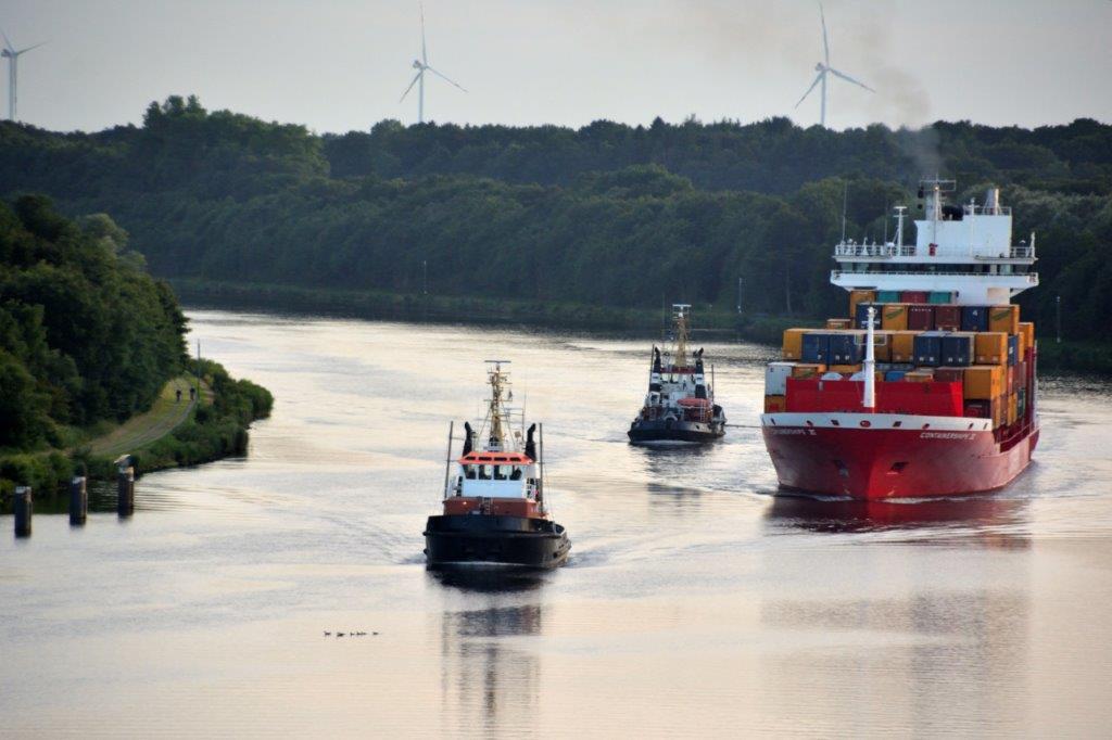 Nicht weit von der Kanalfähre Fischerhütte drosselte Kapitän Krüger die Geschwindigkeit. Wir wurden informiert, dass uns ein richtig großer Pott entgegenkam. Containerships VI, der sogar unter deutscher Flagge fuhr. Schiffe dieser Größenordnung bedürfen Unterstützung vorne und hinten