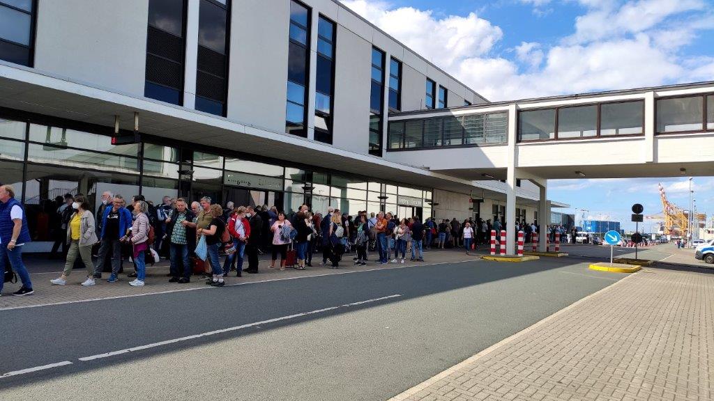Wo es ein Ende gibt, existiert auch ein Beginn. Uns überzeugte das Mein Schiff – Angebot „Norwegen mit Orkney-Inseln“ und schon fanden wir uns nach einer problemlosen Anreise in Bremerhaven wieder. Wir gaben unseren Wagen beim Parkplatzbetreiber ab und ließen uns per Shuttle zum Kreuzfahrtterminal bringen. Dort kam der große Schock: Wir reihten uns ganz hinten in eine gefühlt kilometerlange Warteschlage vor dem Check in ein.