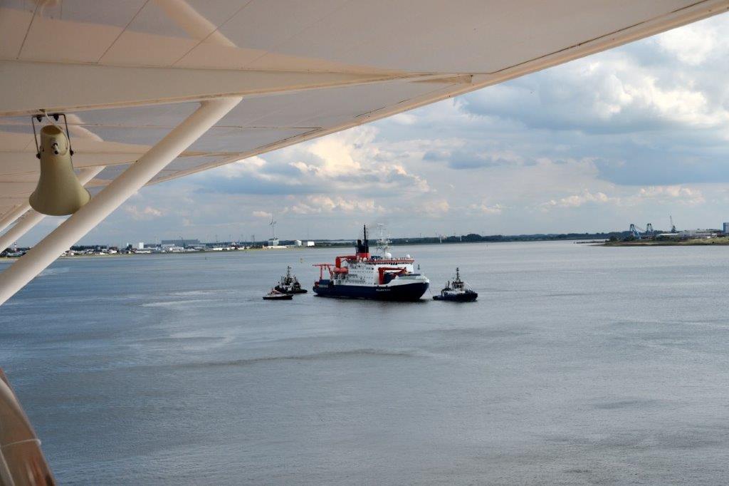 Auf der Backbordseite unseres Schiffes tat sich etwas. Also los – rauf auf den Balkon. Das Forschungsschiff Polarstern wurde von Schleppern in die Fahrrinne der Weser gezogen,