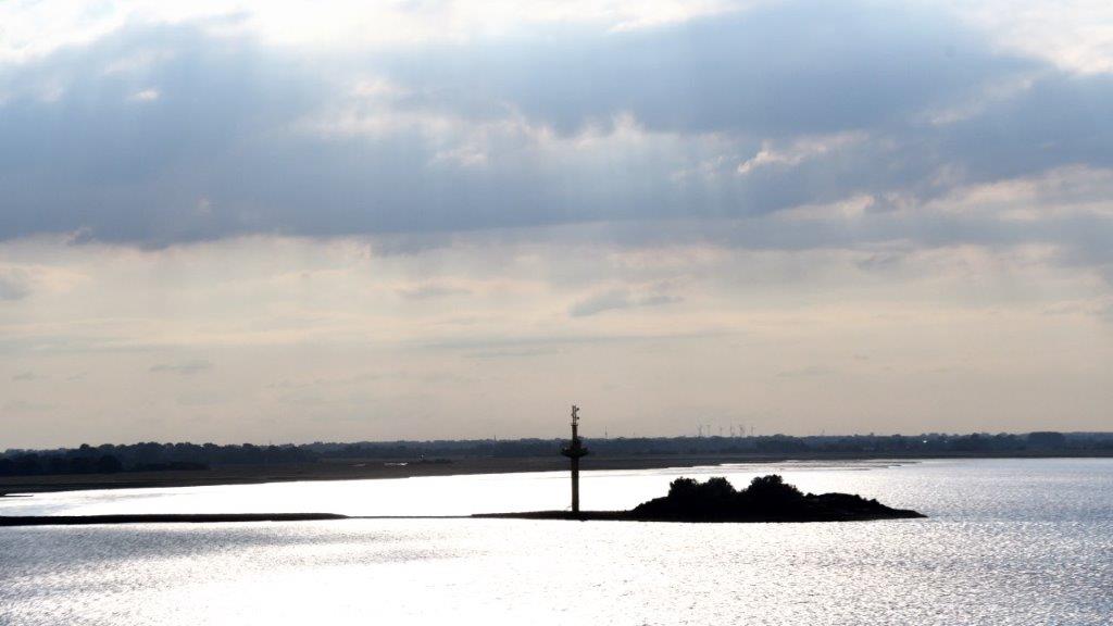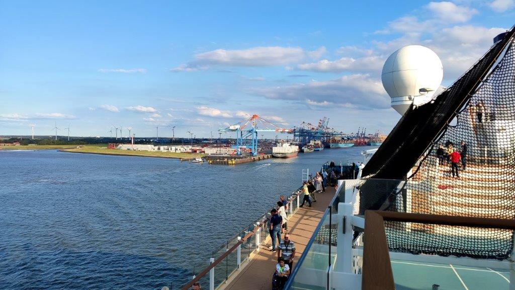 Anschließend nahmen wir eine Kleinigkeit in der Tag und Nacht – Bar zu uns, bevor wir die Schränke mit den Inhalten unserer Koffer füllten. Auch das war schnell erledigt. Gut so, denn das um 45 Minuten verspätete Sail away stand um 17.45 Uhr an. Wir erlebten es bei Typhongedröhne und „Die große Freiheit“ sowie bewaffnet mit dem obligatorischen Auslaufsekt auf Deck 15. Langsam, aber unaufhörlich schob sich Mein Schiff 3 in die Fahrrinne der Weser. Auf der Backbordseite begleitete uns das grüne Ufer der Halbinsel Butjadingen.
