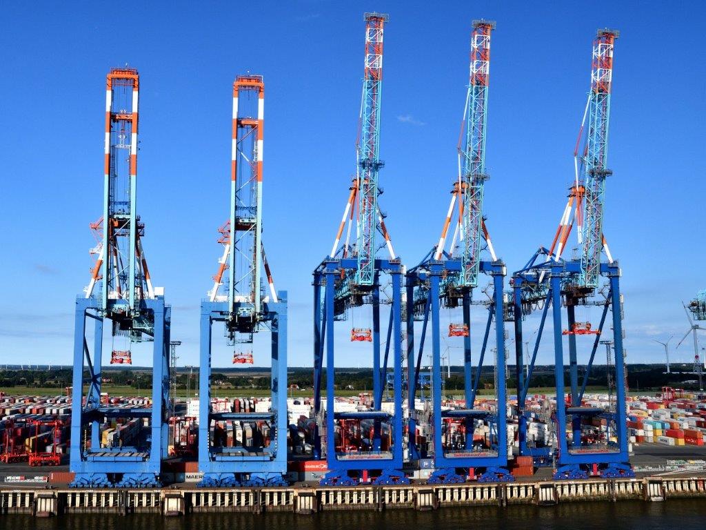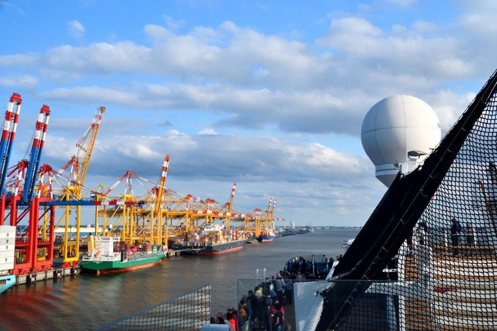 Auf der Steuerbordseite sahen wir zahlreiche Containerkräne vor weitflächigen Containerparkplätzen.