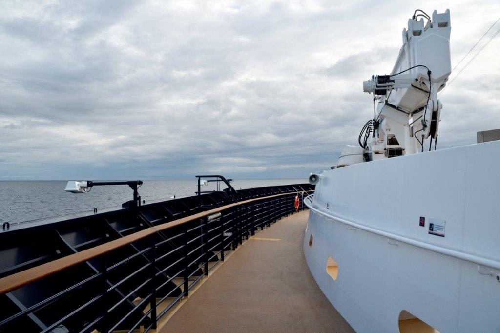 Ich suchte Deck 5 auf. Ein Morgenspaziergang rund um das Schiff gehört zu meiner Morgenroutine. Hmh, in unserer Fahrtrichtung sah es nicht so richtig gut aus.