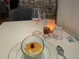 Le bistro war sehr gut. Hier noch ein Bild von meinem Nachtisch. Bessier schwimmend in vaniliesose gefüllt mit etwas himbeercreme.