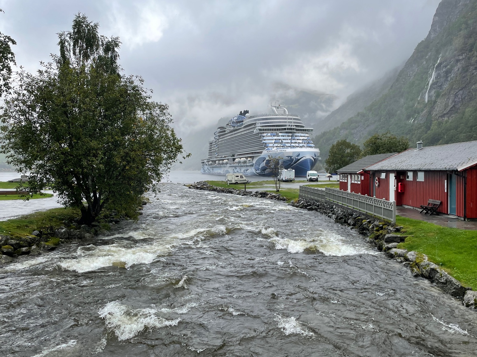 Stranda müsste das Städtchen heißen dan dem wir im Fjord vorbei gefahren sind. Der Teil über den Sitzen ist überdacht und danach kommt noch Wein weg was heute ganz angenehm war wegen dem Regen.