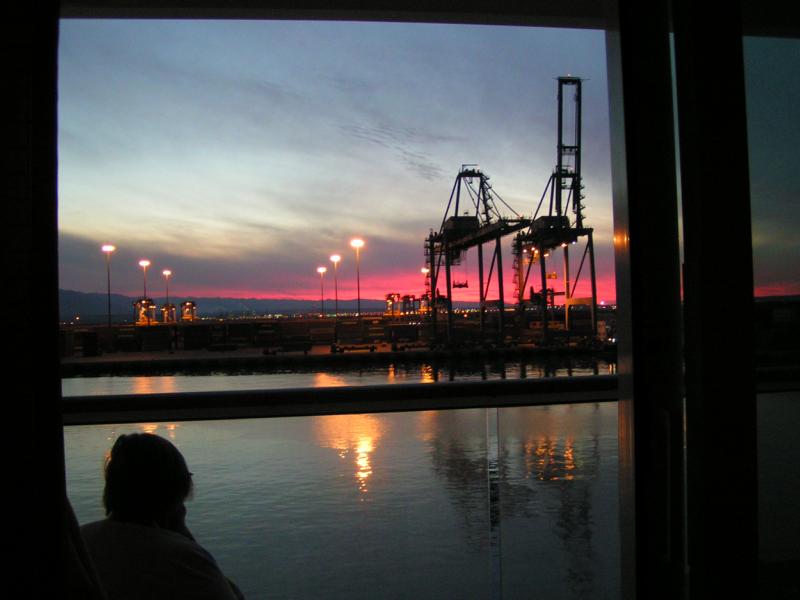 Und wieder haben wir zwei einen ruhigen Tag. In Kairo waren wir schon mal zu der Zeit, als es dort politisch noch einigermaßen ruhig zuging. Wieder haben wir das Schiff fast für uns alleine. Die Sonne scheint wie die Tage vorher und wir drehen am frühen morgen nach dem Frühstück ein richtig lange Bordrunde. Bewegung ist das A und O im Alter und wir wollen doch noch lange fit bleiben oder? Da wir niemanden trafen, der uns gemeinsam fotografierte, machte ich einfach ein Spiegelbild von uns. Der Blick auf den Hafen wieder etwas langweilig, lauter Container und Kräne – aber es sehr ruhig hier.