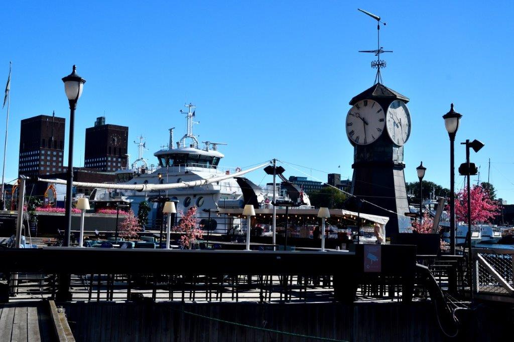 Wir durchstießen den in den 80er Jahren entkernten industriellen Stadtteil Aker Brygge mit nunmehr einträchtig nebeneinander stehenden aufgeprotzten Fabrik- sowie modernen Neubauten und standen nach kurzer Zeit am Rande der Bucht Pipervika. Dort, wo auch an diesem Tag das Leben spielte. Nun gut, noch nicht so richtig, denn es war noch recht früh. Es sollte sich aber im Laufe des Tages ändern. Hinter den Anlegestellen für Yachten lugte eins der Stadtzeichen Oslos hervor.