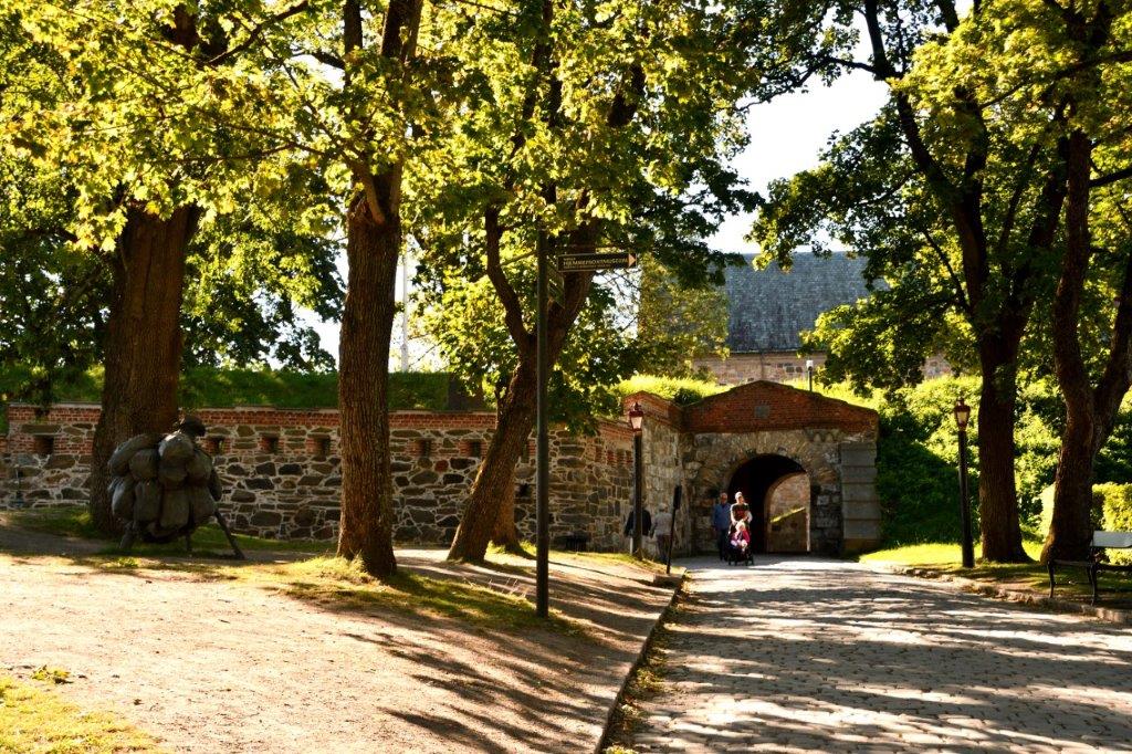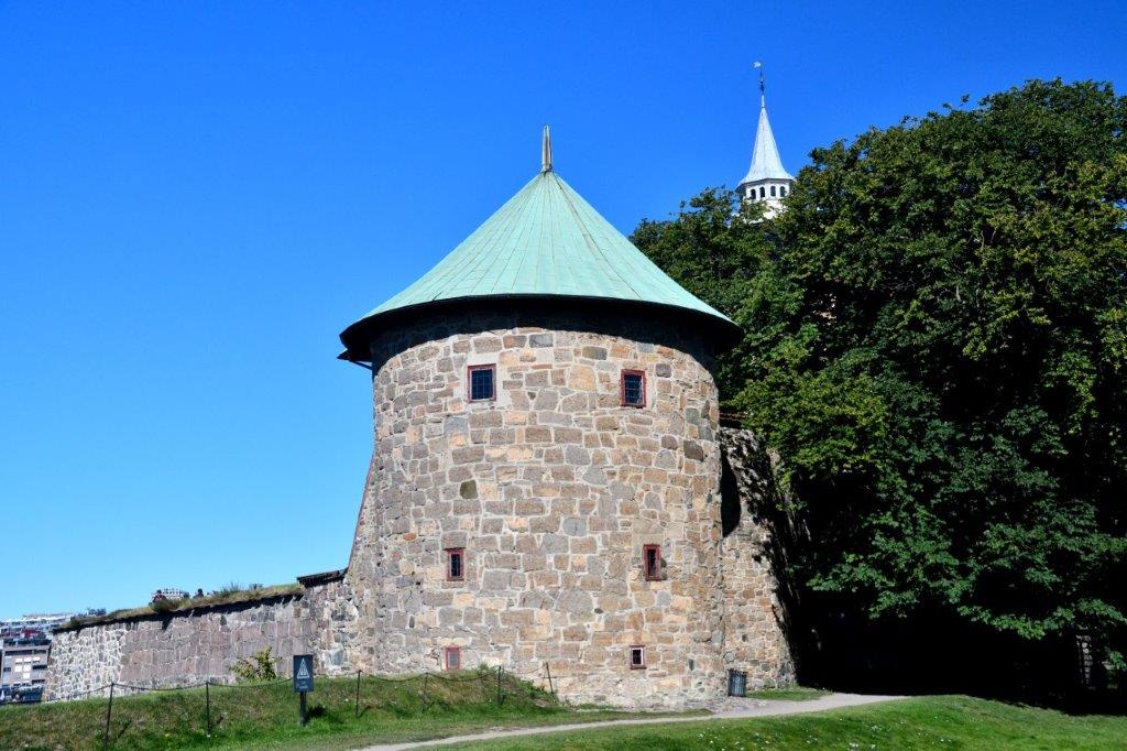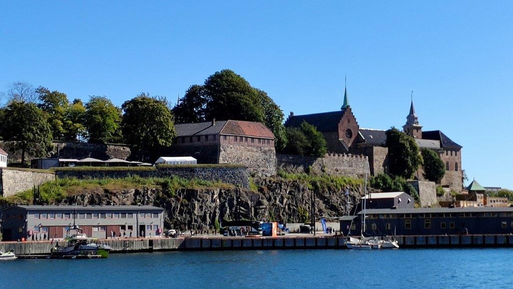 Ganz schön weitläufig und mächtig. So war es noch nicht, als um 1300 Oslo zur Hauptstadt Norwegens wurde und der damalige König meinte, zur Abwehr von irgendwann kommenden Feinden ein Bollwerk schaffen zu müssen. Nach und nach wurde die Festung erweitert. Neben den Anlagen zur Abwehr von Angreifern entstand natürlich als ein Mittelpunkt ein Schloss incl. Kirche. Nach und nach wurde das Fort erweitert, stand ab und zu im Fokus kriegerischer Auseinandersetzungen und verfügte über das, was man für ein derartiges Bollwerk benötigte: Pulvermagazine, Zisterne, Marstall, Verwaltungsgebäude, Wohnstätten, … Nunmehr alles penibel restauriert und sehr gut erhalten. Das mussten wir sehen. Also rein – rein durch ein Nebentor der inneren Bastion (Der äußere Wall ist größtenteils nicht mehr erhalten):