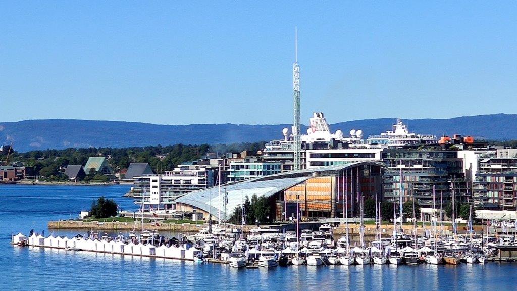 Ein hervorragender Ausblick auf einen der schönsten Teile von Norwegens Hauptstadt. Der Stadtteil Tjuvholmen, hinter dem sich Mein Schiff 3 versteckte; vorne das Astrup Fearnley Museum of Modern Art; im Hintergrund ein Teil der Museumshalbinsel Bygdøy mit dem Fram-Museum. Wenn wir schon einmal beim Museum sind: