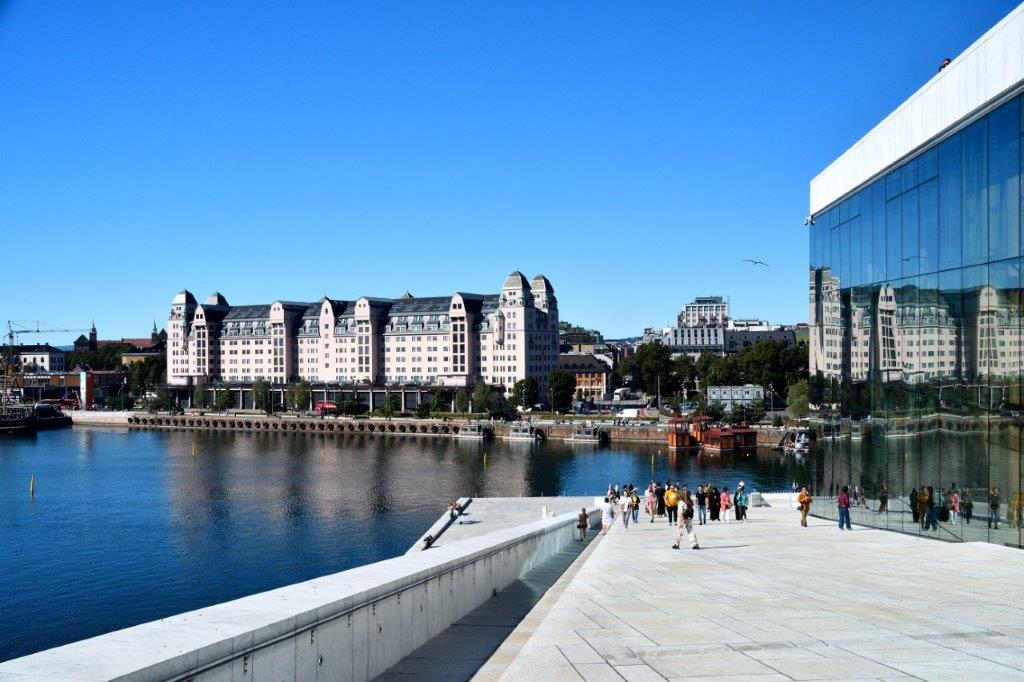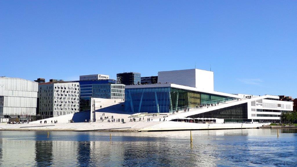 Beeindruckend! Schneeweiß. Wie ein Eisberg. Passend zum Norden und damit zu Oslo. Im Hintergrund zur Oper passende Wohn- und Bürobauten. Wenn man diese Silhouette sieht, kann man sich nicht vorstellen, dass dort anstelle der Oper und der dahinterliegenden „Barcode-Häuser“ vor 25 Jahren ein stark genutzter Containerhafen sowie die viel befahrene Europastraße 18 angesiedelt war. Die Hafenanlagen wurden dem Erdboden gleichgemacht, die Europastraße durch Tunnel auf die andere Seite Oslos geführt und dafür ein Juwel erbaut. Vom Beginn der Planung bis zur Eröffnung der Oper vergingen zehn Jahre; die um fünf Monate vorverlegte Fertigstellung dauerte von der Grundsteinlegung bis zur Eröffnungsgala vier Jahre. So, wie sie auf dem Wasser zu schwimmen scheint, ist sie riesig. 207 m lang und 110 m breit. Das Schöne an diesem vermeintlichen Eisberg: Wir konnten ihn besteigen!
