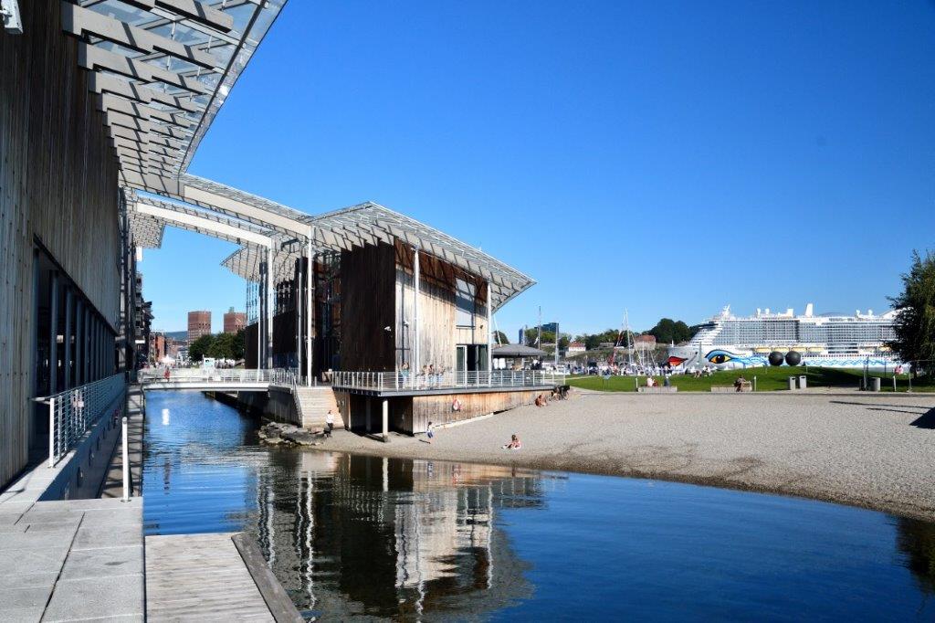 Leider standen uns die repräsentativen Gebäude im Wege – wir konnten nicht auf direktem Wege die nächste Osloer Bucht Bjørvika erreichen. Und trotzdem schafften wir es nach einigen Umwegen. Und sahen, dass an diesem Tag unsere Mein Schiff 3 nicht das einzige Kreuzfahrtschiff in Oslo war. Die Viking Jupiter lag gut gesichert im Schatten einer Dienststelle des Verteidigungsministeriums. Dieses war allerdings nicht unser nächstes Hauptziel – vielmehr die Oper von Oslo.