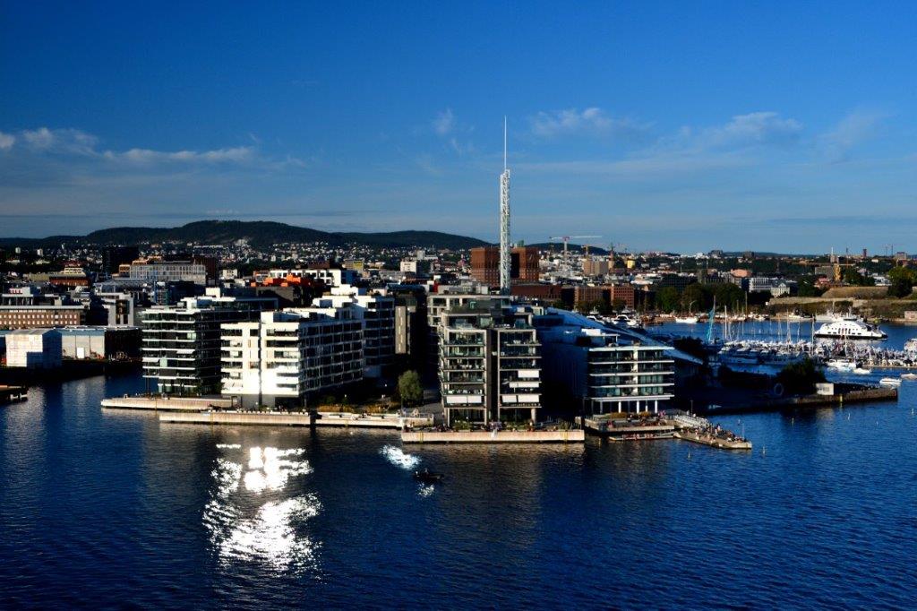 Neben uns unser Schiff unter strahlend blauem Himmel, vor uns einige der in den letzten Jahren hochgezogenen Prachtbauten von Tjuvholmen. Funktionell und trotzdem nicht langweilig. In exponierter Lage. Mit traumhaften Ausblicken. Nicht fragen, wieviel man für eine derartige Wohnung mit Ausblick auf den Fjord berappen müsste …